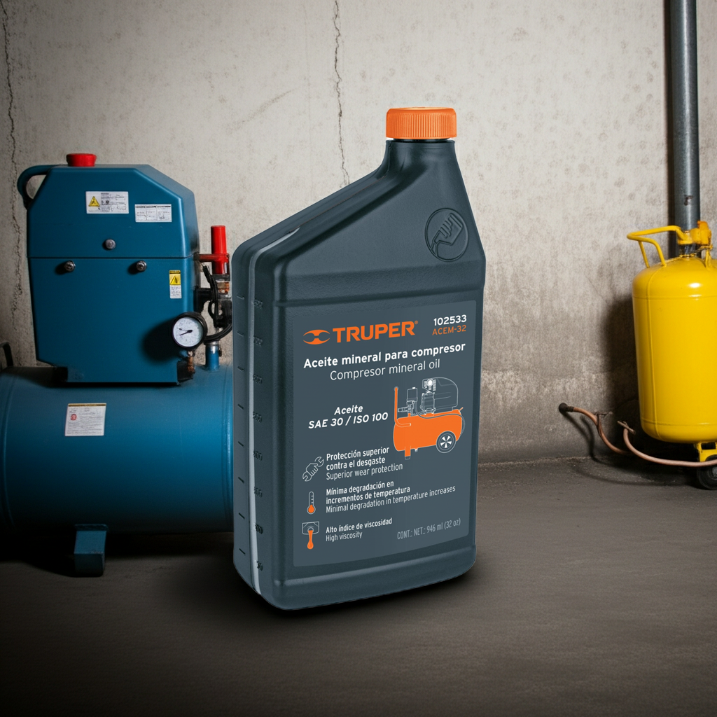 Aceite mineral de alta calidad para compresor de aire Truper - Mantén tu compresor funcionando de manera óptima con este lubricante profesional de 946ml (32oz).