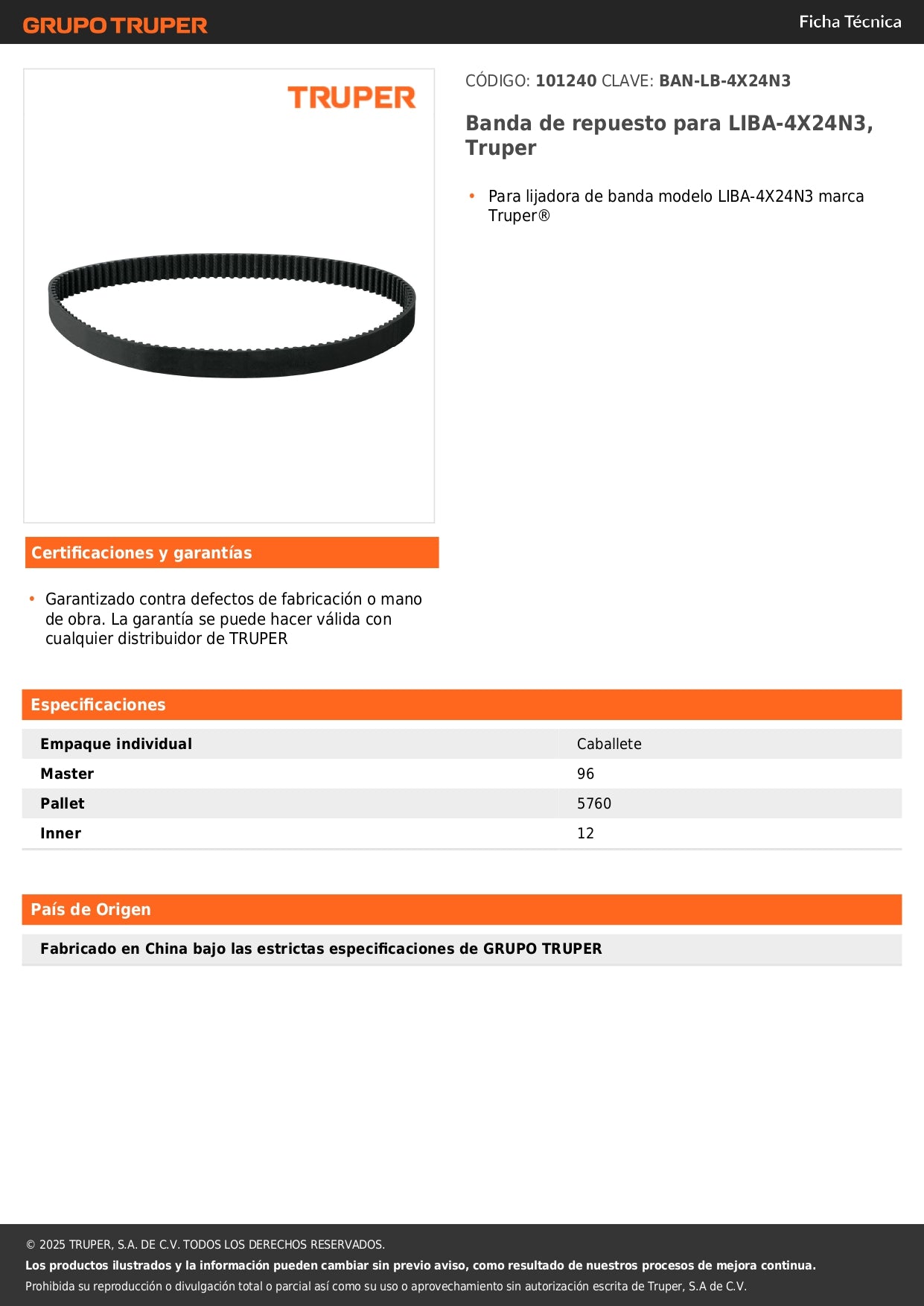 Banda de Repuesto para Lijadora LIBA-4X24N3 Truper - Accesorio Original