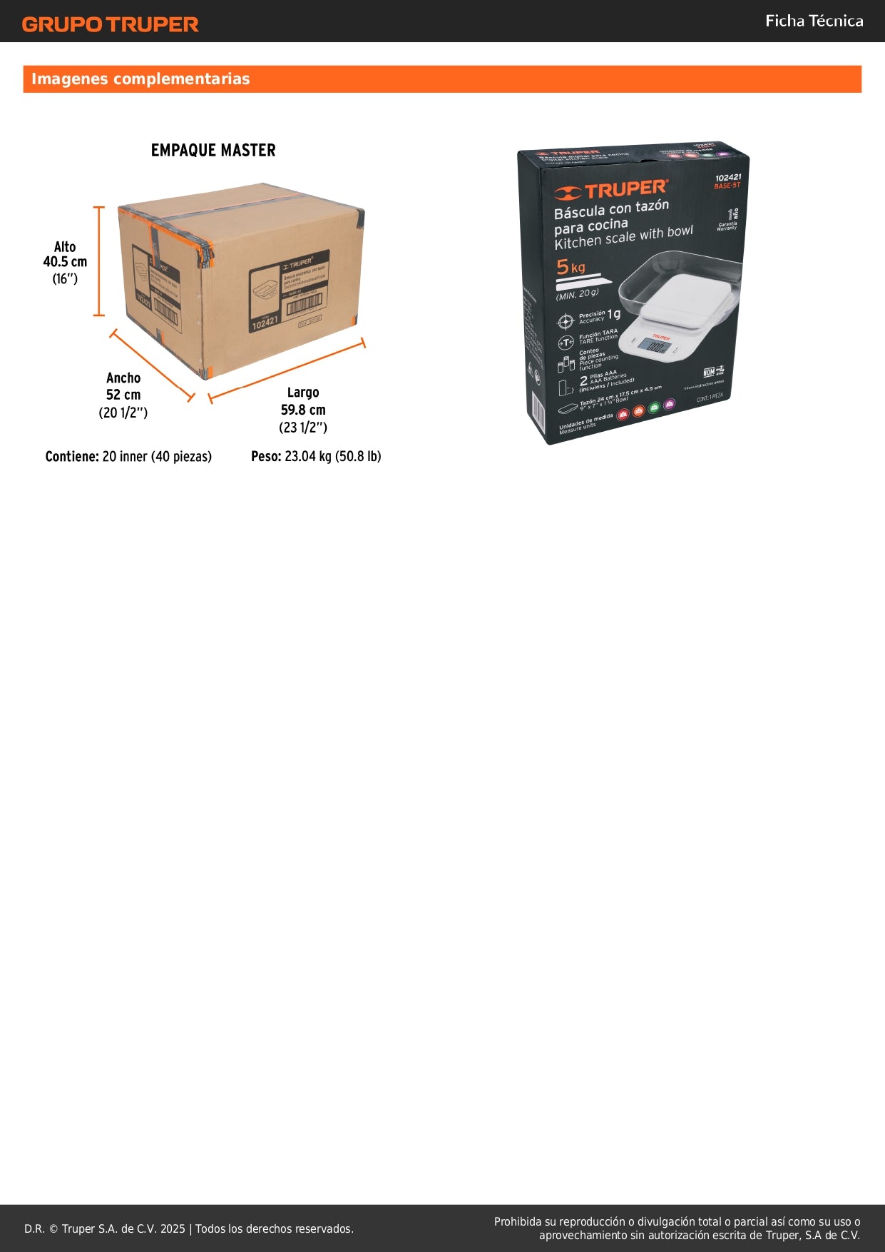Ya sea que estés preparando recetas de repostería que requieren medidas exactas, controlando porciones para una dieta balanceada, o simplemente cocinando tus platillos favoritos, esta báscula de cocina digital te brinda la precisión que necesitas. La marca Truper garantiza calidad y durabilidad.