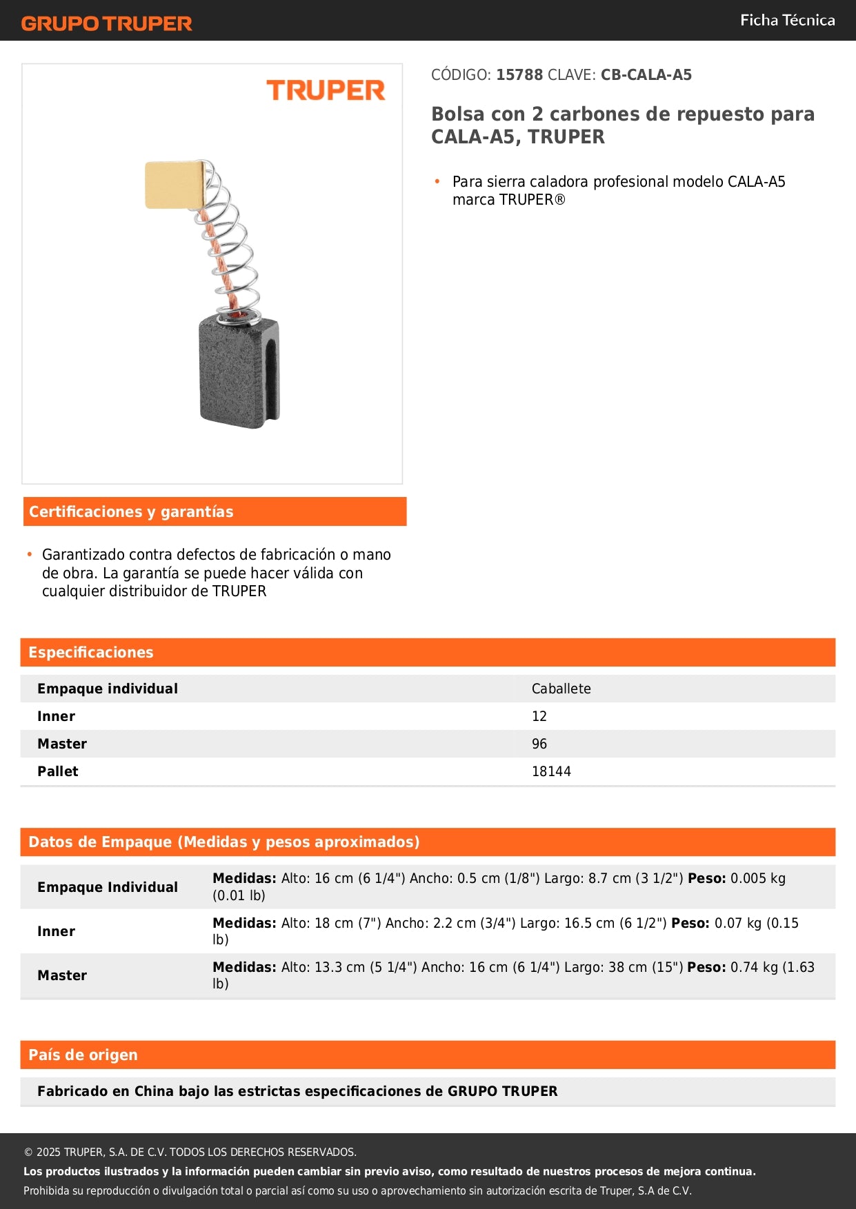 Bolsa con 2 carbones de repuesto originales TRUPER diseñados específicamente para esmeriladora angular modelo CALA-A5. Estos carbones garantizan el rendimiento óptimo y la vida útil prolongada de tu herramienta eléctrica.