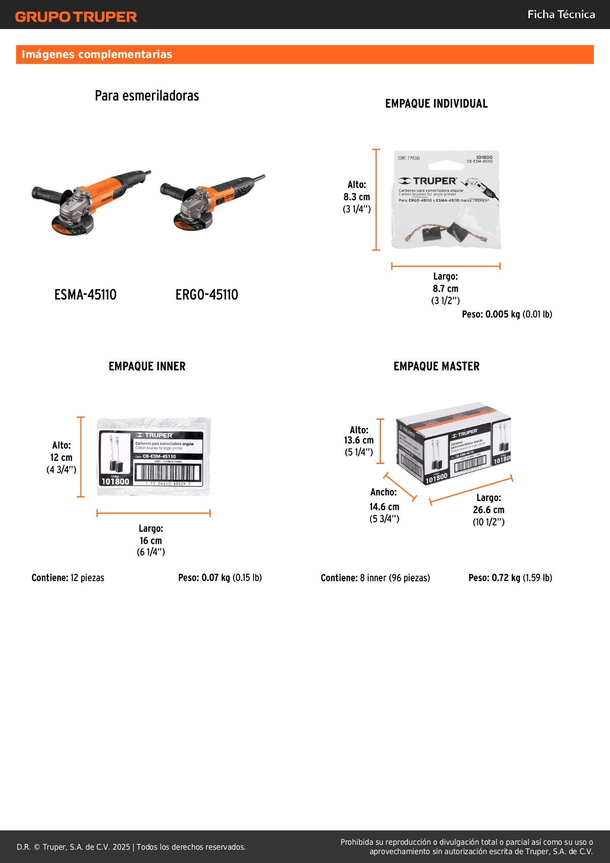 Mantén tu esmeriladora angular TRUPER funcionando al máximo rendimiento con estos carbones de repuesto originales. Diseñados específicamente para el modelo ESM-45110, estos carbones garantizan la continuidad operativa de tu herramienta eléctrica profesional.