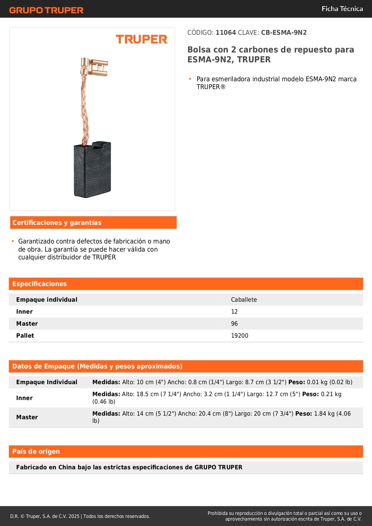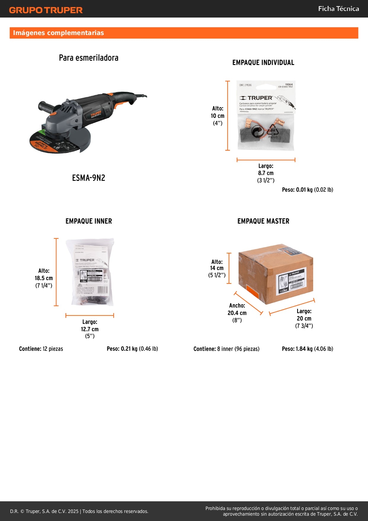 Invierte en repuestos originales TRUPER y asegura el mejor desempeño de tu equipo. Estos carbones son la solución profesional para mantener tu esmeriladora en óptimas condiciones de trabajo.