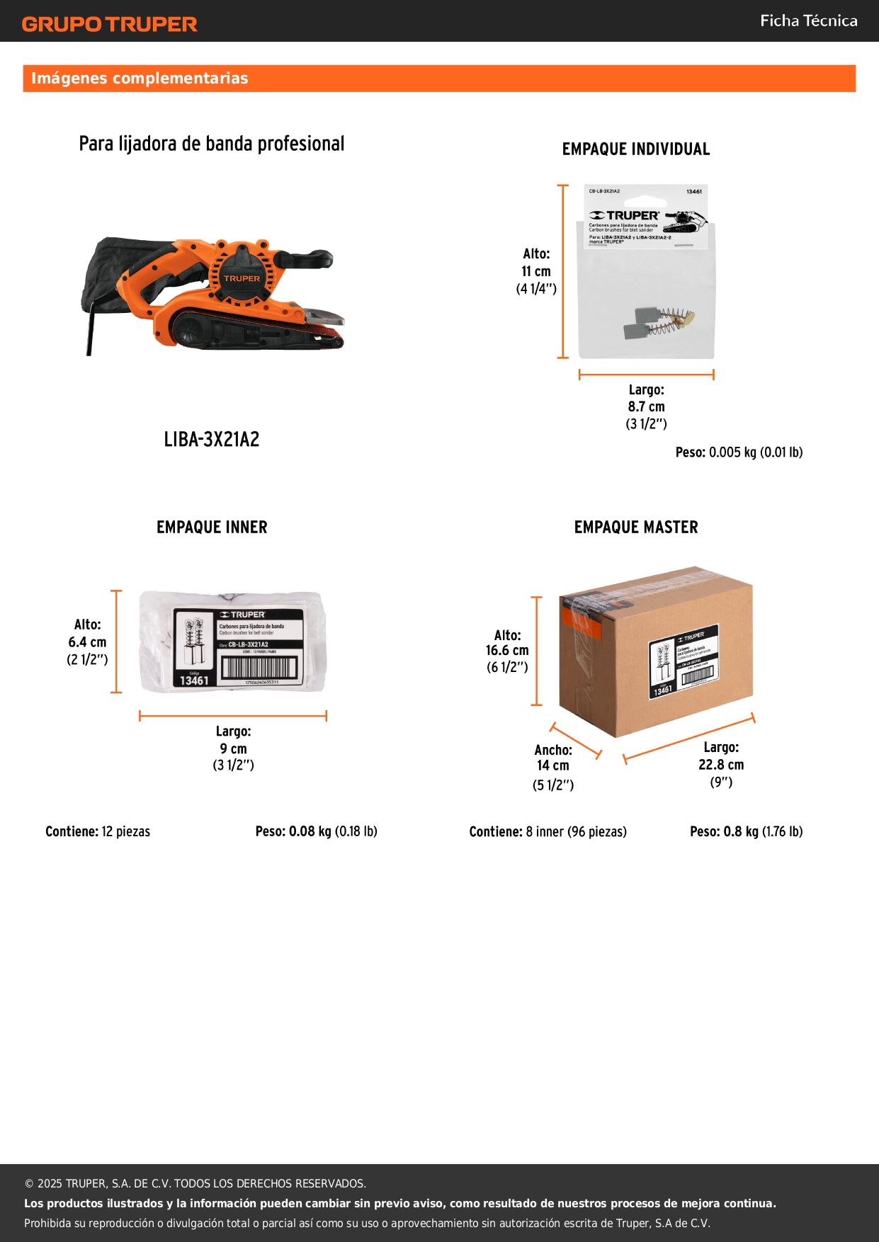 Bolsa con 2 carbones de repuesto originales TRUPER diseñados específicamente para la lijadora de banda modelo LIBA-3X21A2. Estos carbones garantizan el funcionamiento óptimo del motor de tu herramienta eléctrica.