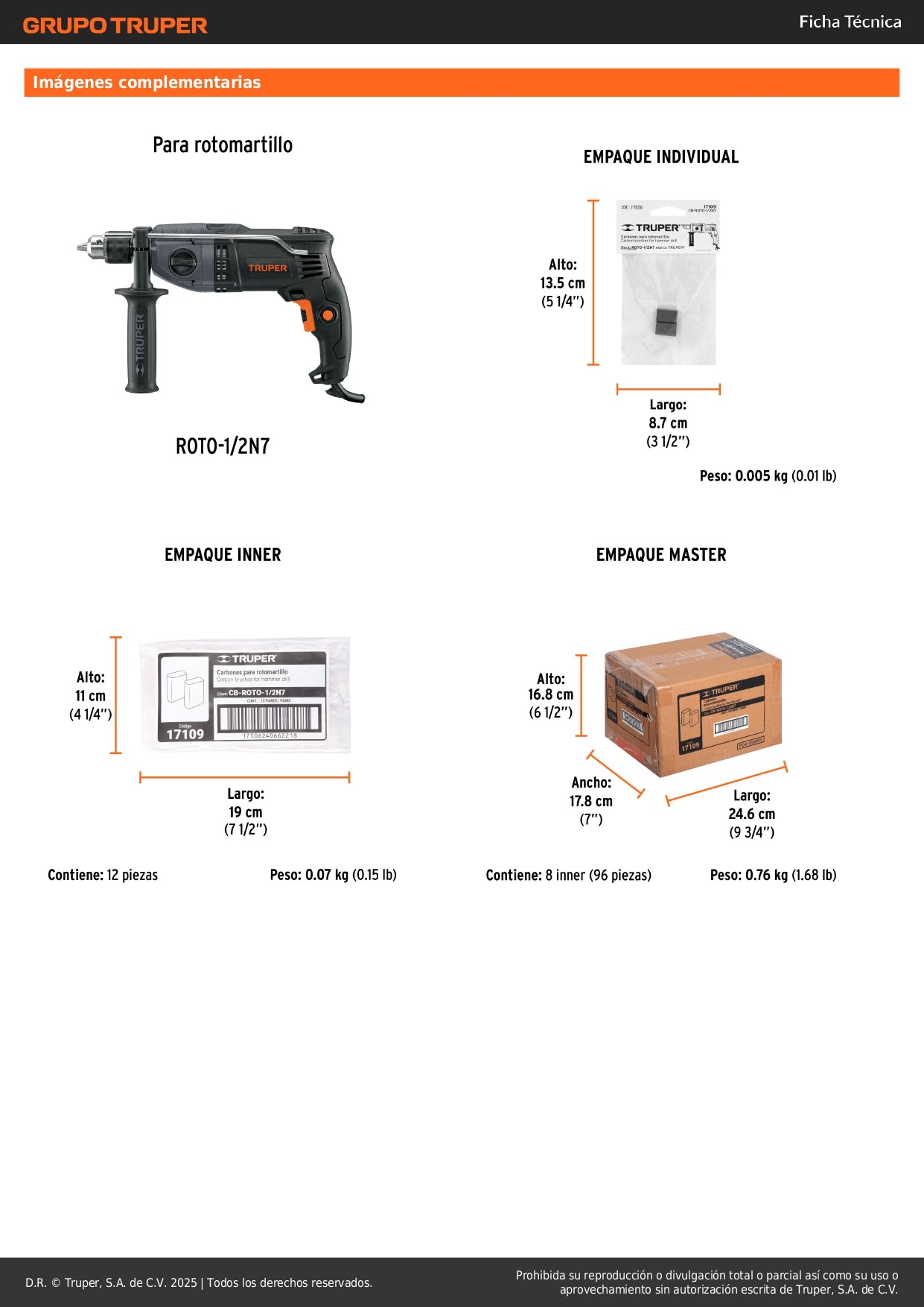 Bolsa con 2 carbones de repuesto originales TRUPER diseñados específicamente para el rotomartillo modelo ROTO-1/2N7. Estos carbones garantizan el rendimiento óptimo y la durabilidad de tu herramienta eléctrica profesional.