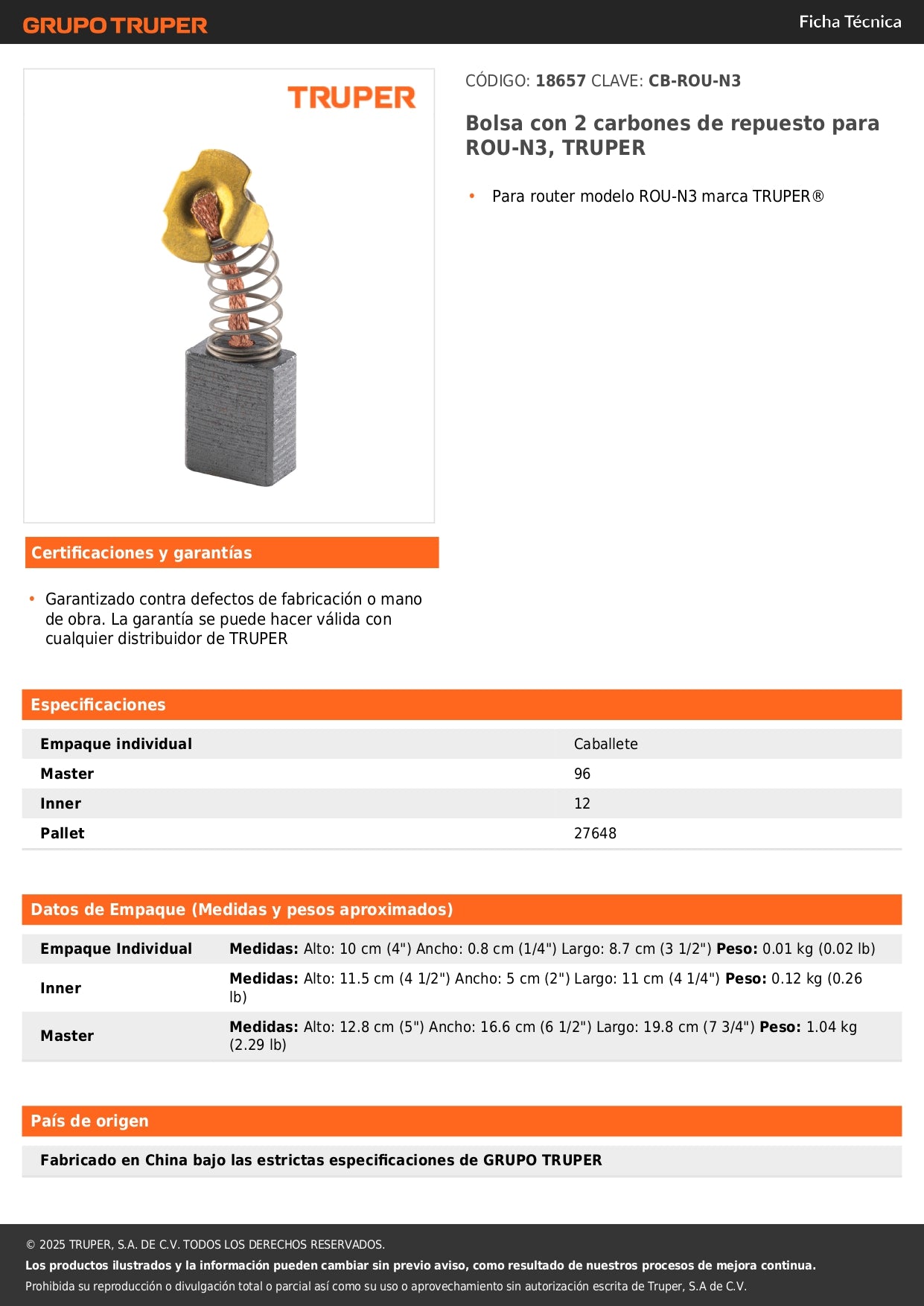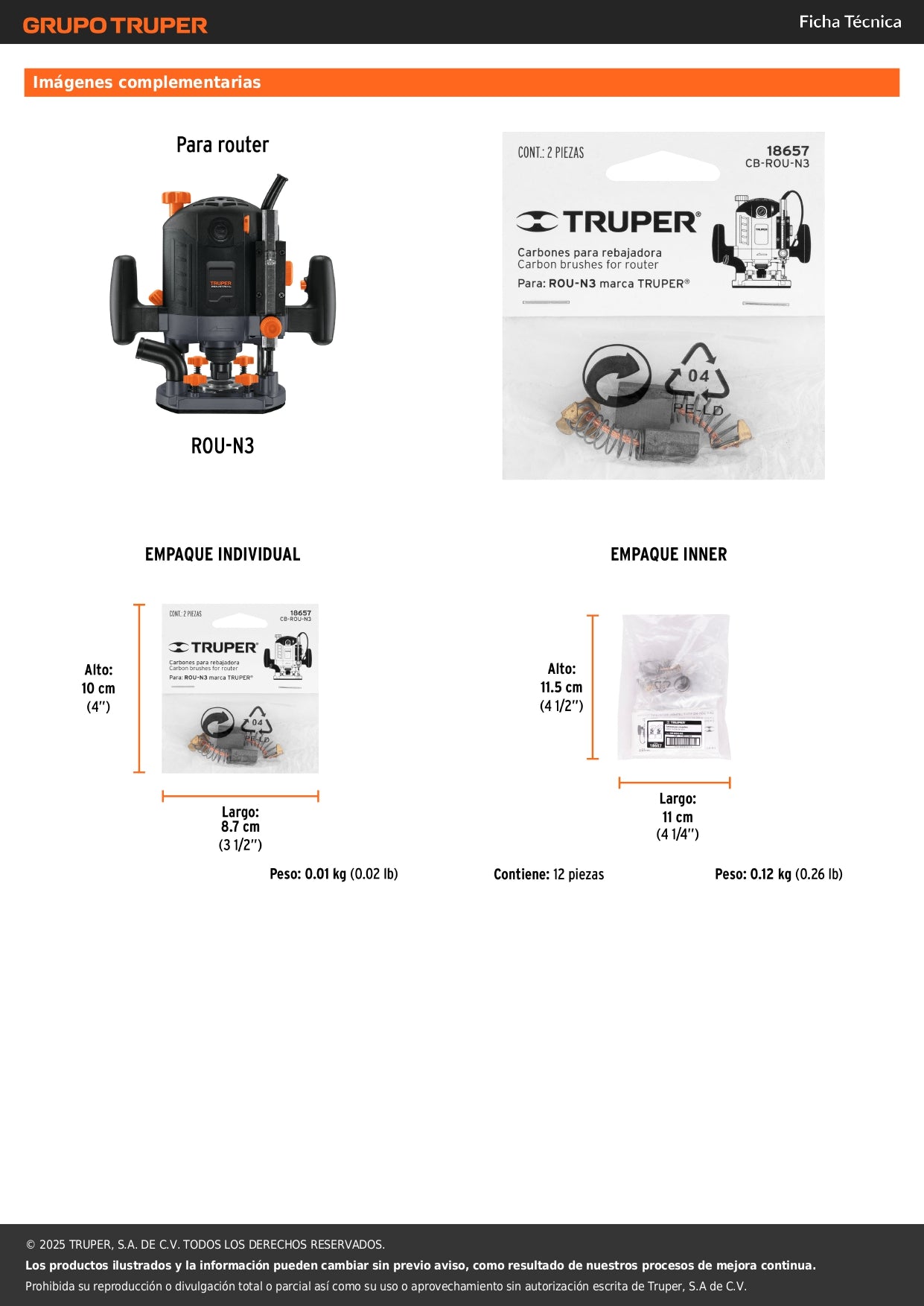 Mantén tu router TRUPER funcionando al máximo rendimiento con estos carbones de repuesto originales. Diseñados específicamente para el modelo ROU-N3, garantizan compatibilidad perfecta y durabilidad superior.