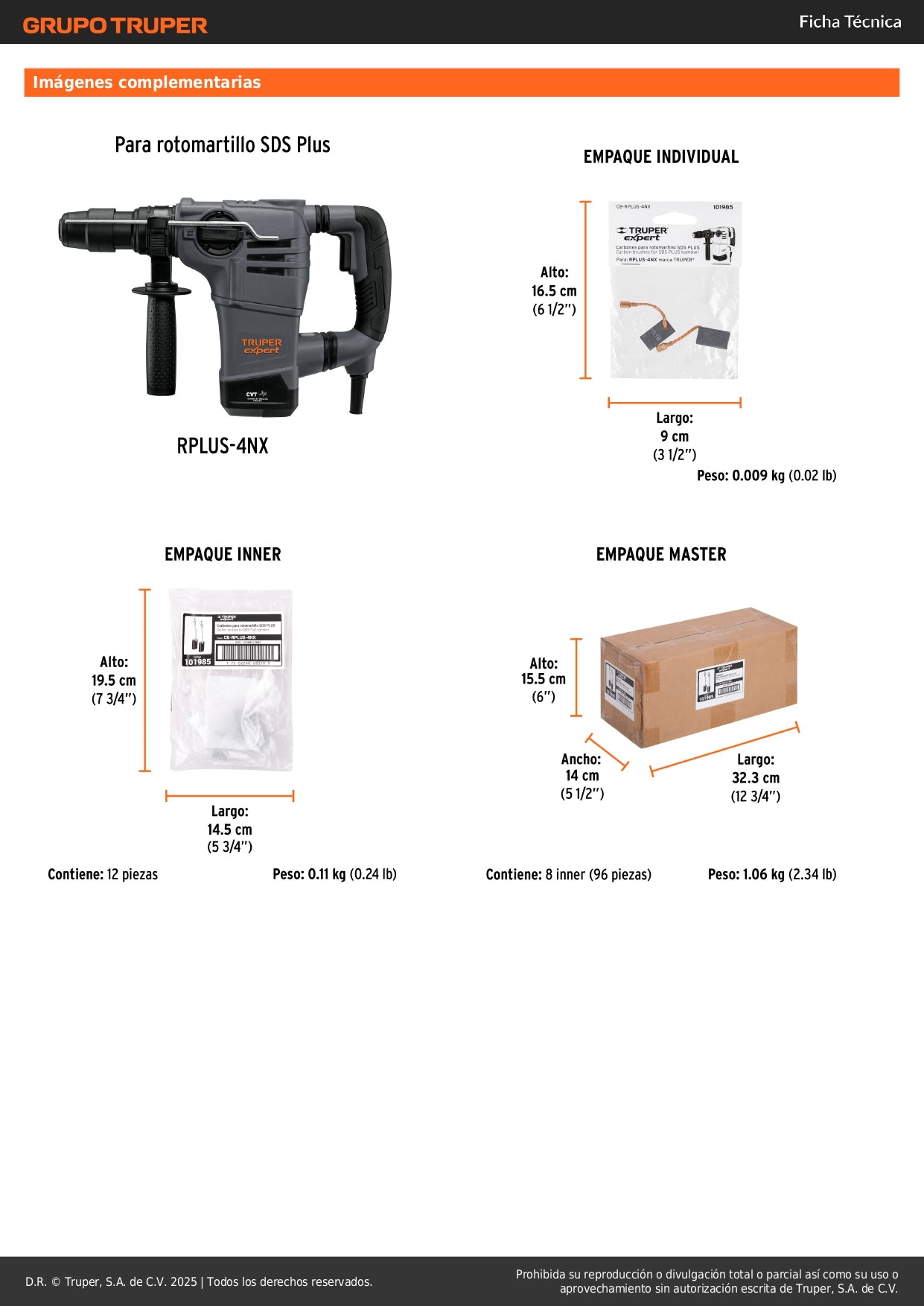 Bolsa con 2 carbones de repuesto originales TRUPER diseñados específicamente para el rotomartillo modelo RPLUS-4NX. Estos carbones de grafito garantizan el rendimiento óptimo y la vida útil prolongada de tu herramienta eléctrica.