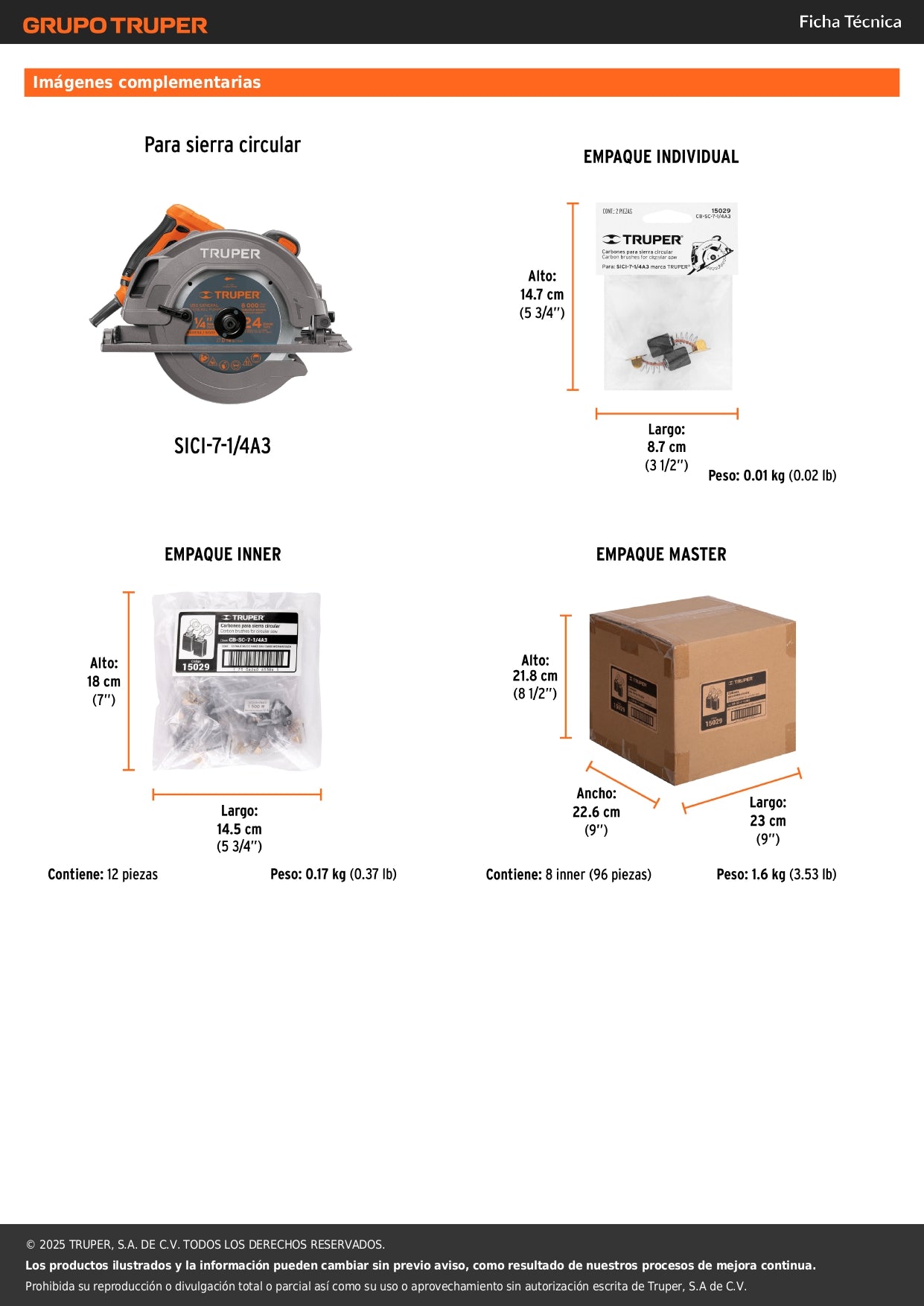 Los carbones de repuesto originales aseguran la transmisión correcta de corriente eléctrica al motor de tu sierra circular, evitando sobrecalentamientos, pérdida de potencia y daños mayores. Mantén tu herramienta en condiciones óptimas con refacciones genuinas TRUPER.