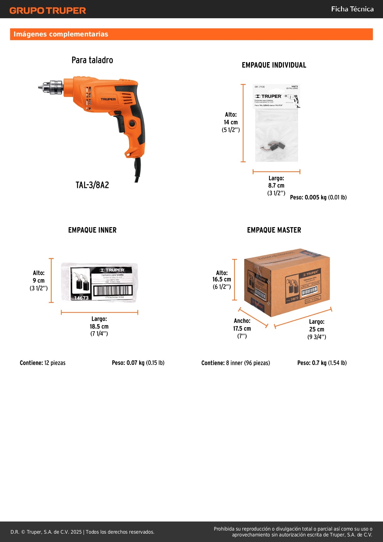 Bolsa con 2 carbones de repuesto originales TRUPER diseñados específicamente para el modelo de taladro TAL-3/8A2. Estos carbones garantizan el correcto funcionamiento y máximo rendimiento de tu herramienta eléctrica.