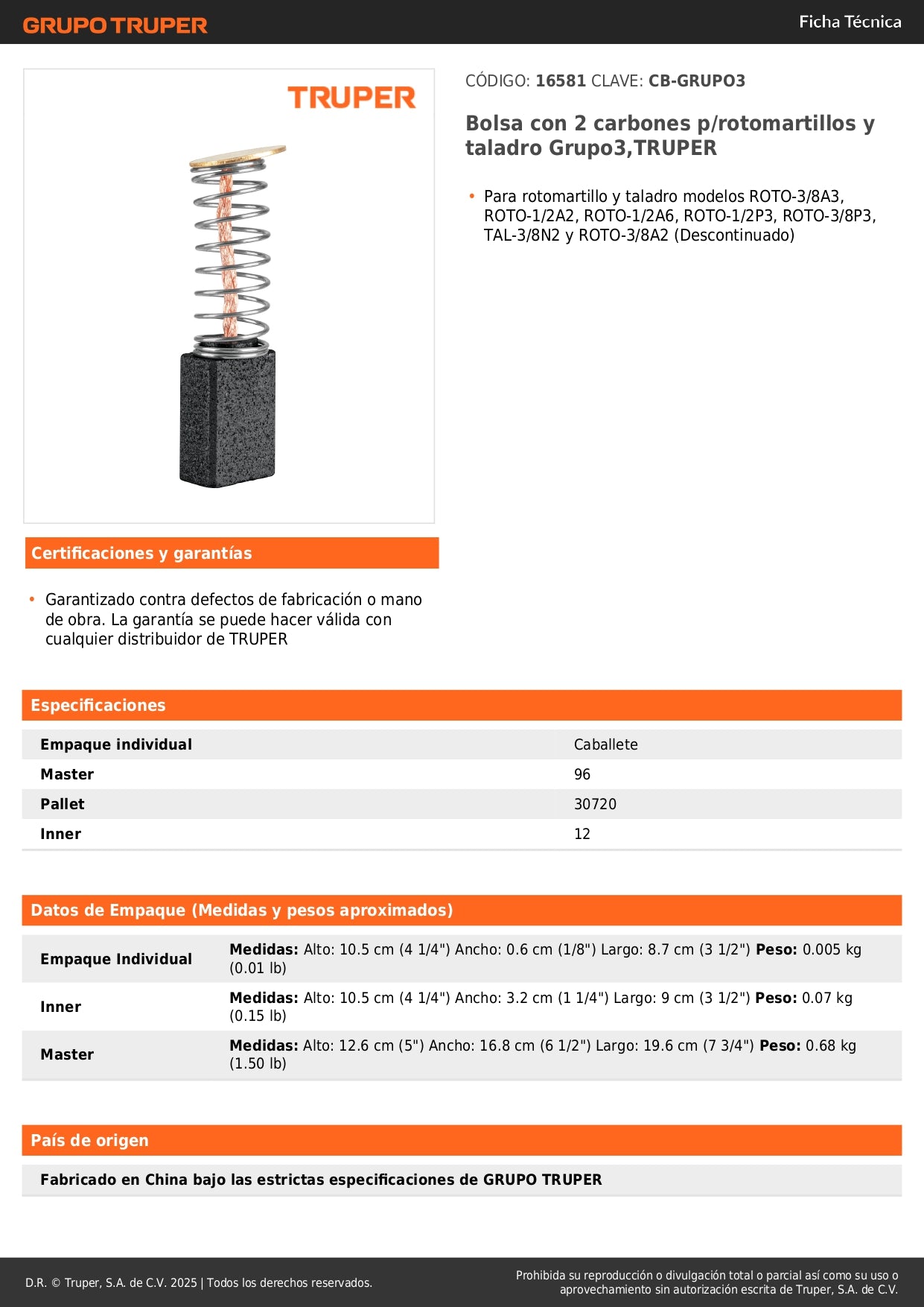 Bolsa con 2 carbones p/rotomartillos y taladro Grupo3,TRUPER