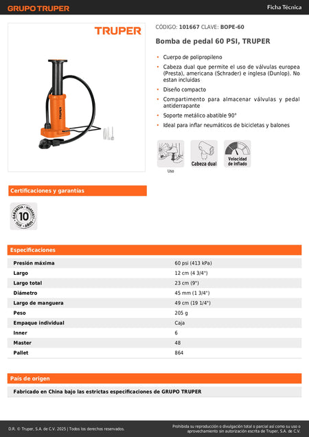 Casa»Bomba de Pedal TRUPER 60 PSI - Inflador Universal para Bicicletas y Balones con Cabeza Dual y Soporte Abatible - Solución Compacta para Inflado Rápido y Preciso