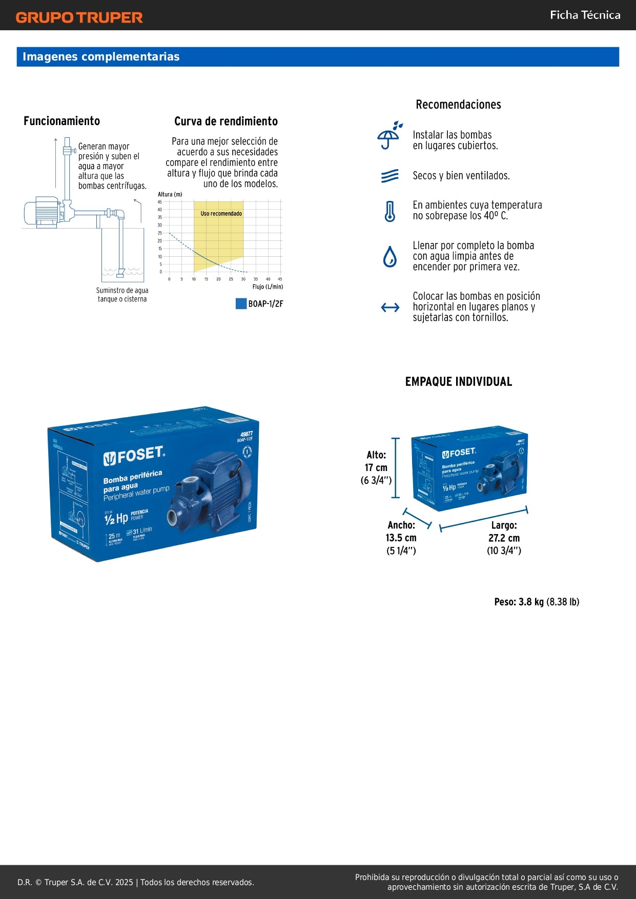 Bomba de agua periférica profesional ideal para uso doméstico, agrícola y riego. Con motor de 1/2 HP y capacidad de bombeo hasta 25 metros de altura, esta bomba FOSET garantiza un rendimiento superior en el suministro de agua limpia.