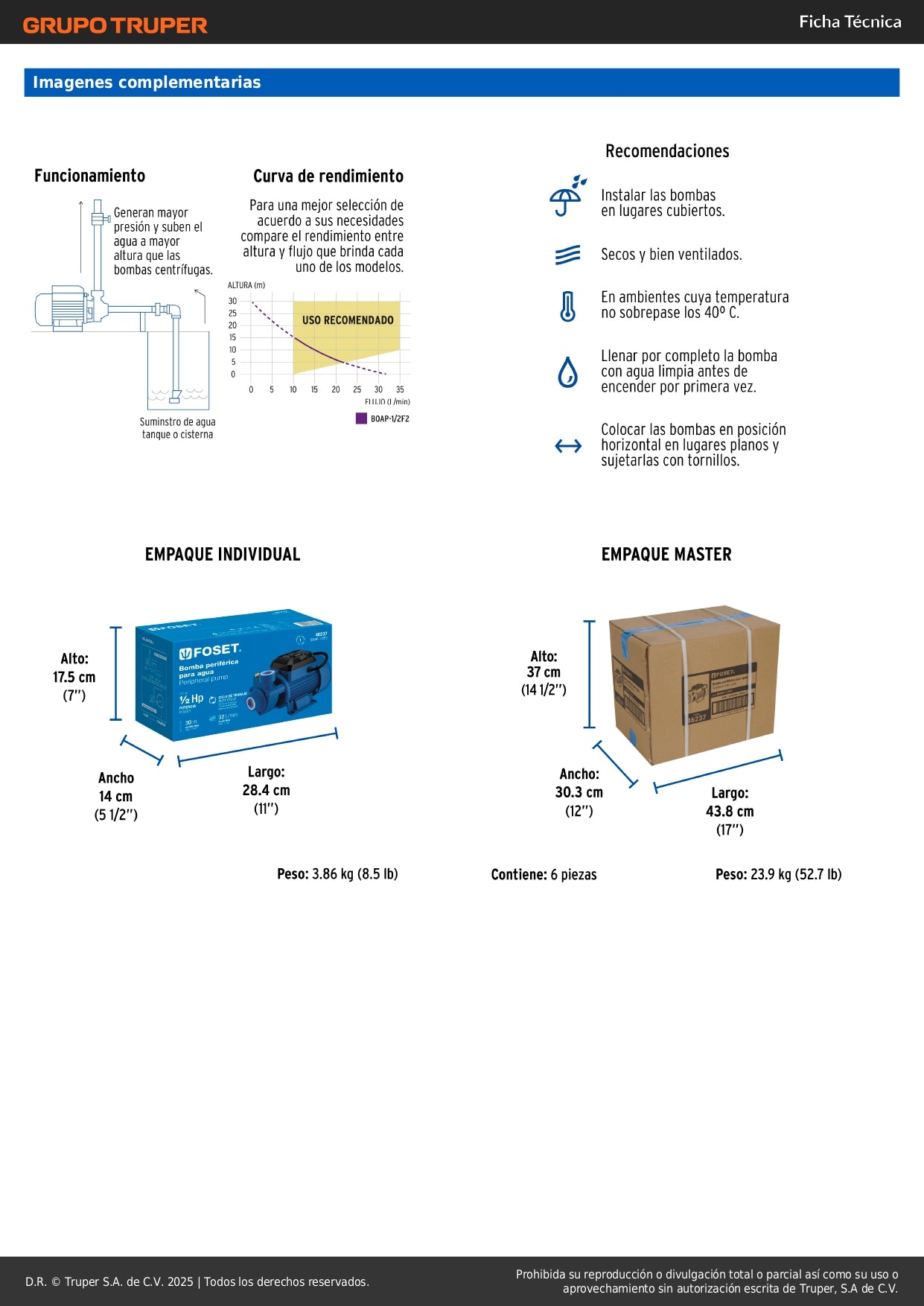 - Altura máxima de bombeo: 30 metros