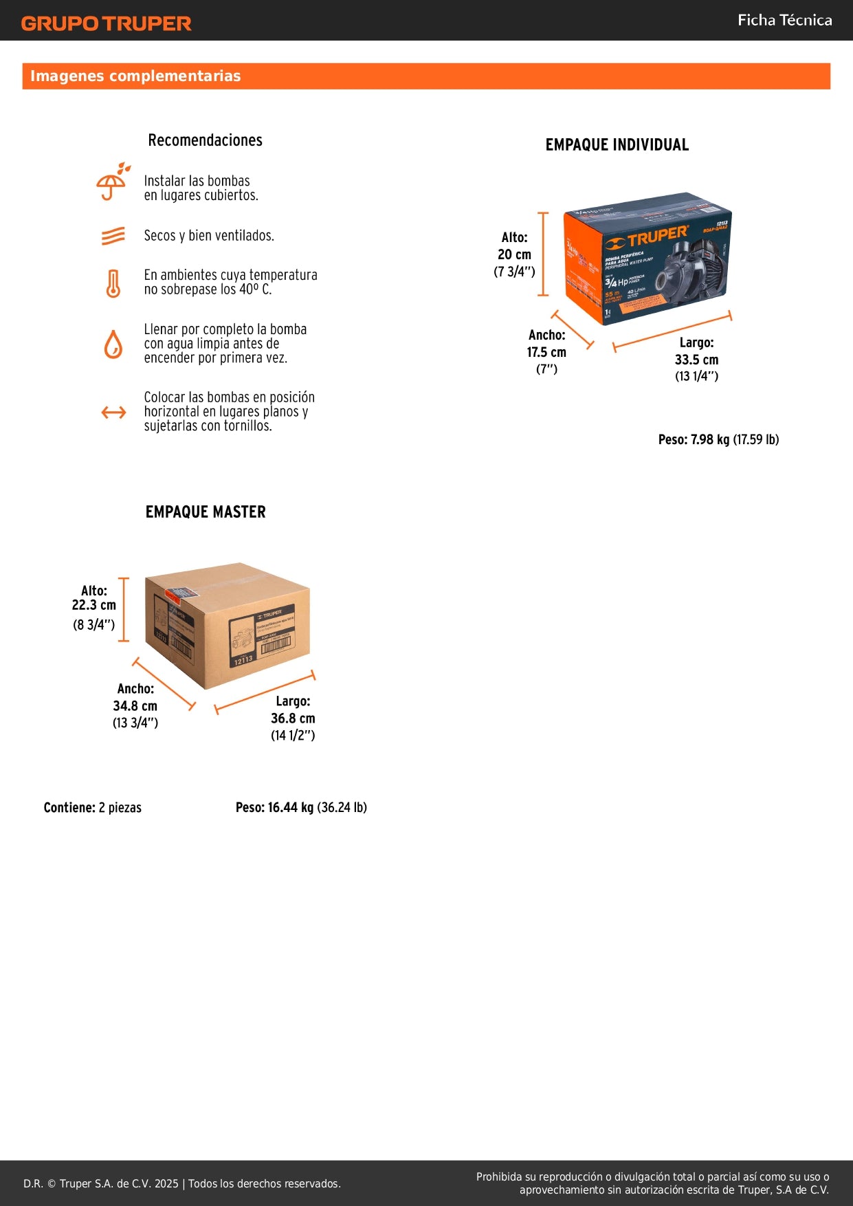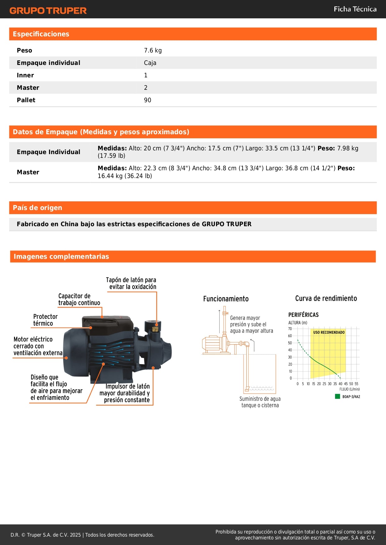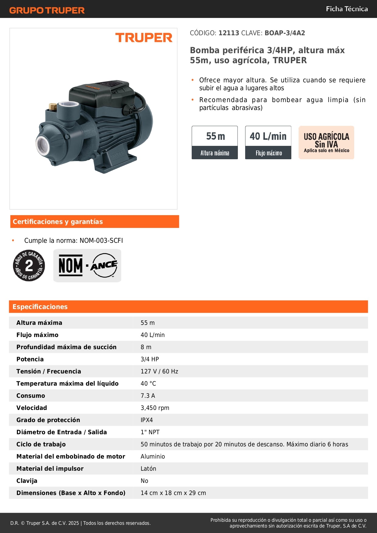 Bomba periférica profesional | Motor 3/4 HP | Altura 55m | Agua limpia | Uso agrícola | TRUPER Original