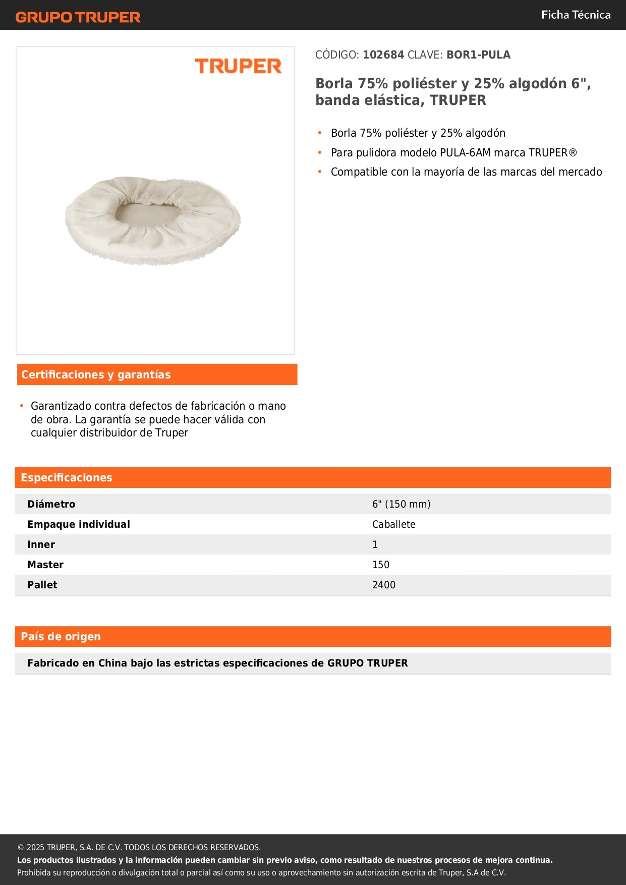 Borla 75% poliéster y 25% algodón 6", banda elástica, TRUPER