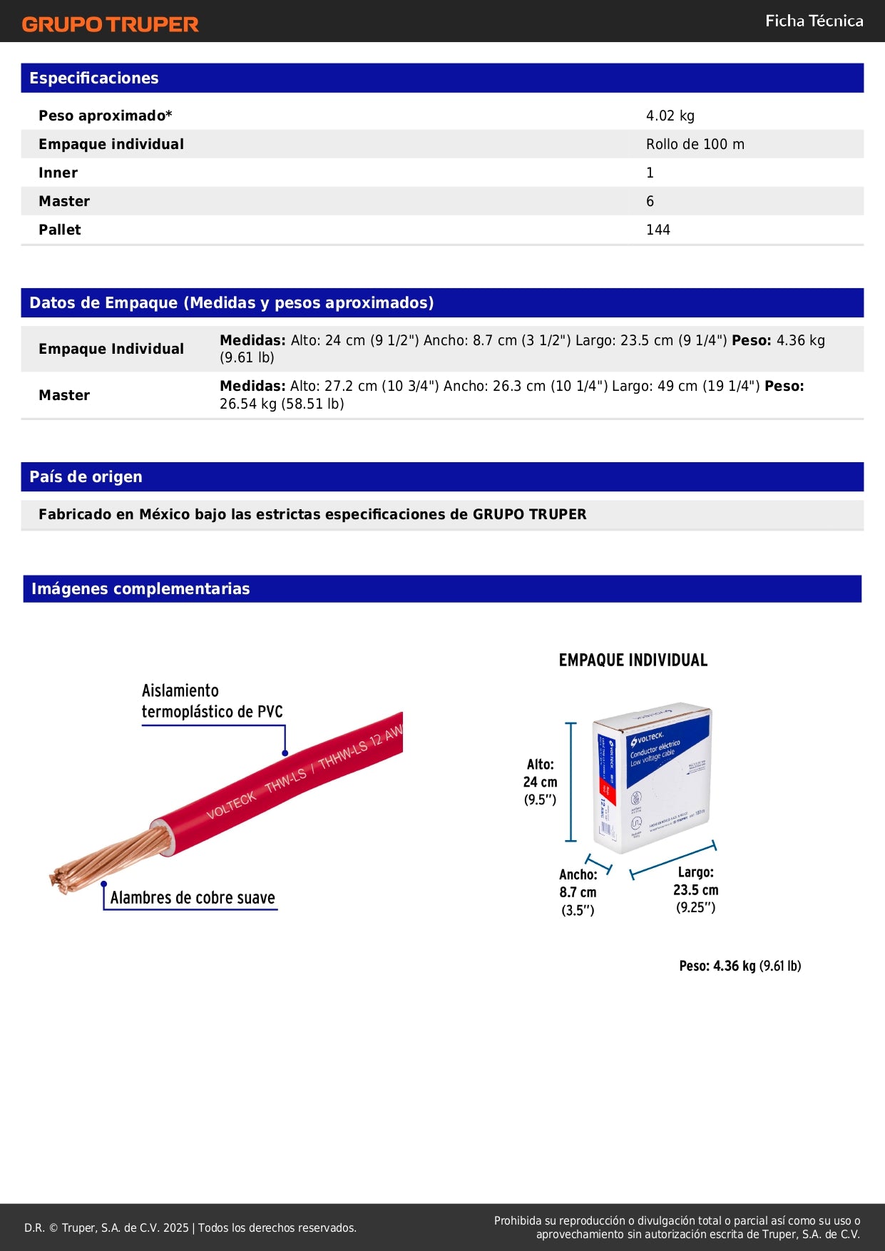 - Calibre: 12 AWG - perfecto para circuitos de iluminación y contactos