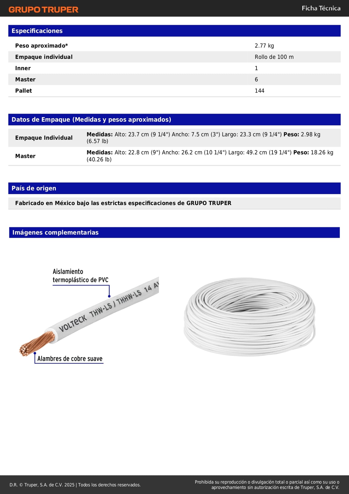 Cable THHW-LS 14 AWG Blanco 100m Volteck - Solución Profesional para Instalaciones Eléctricas Residenciales y Comerciales