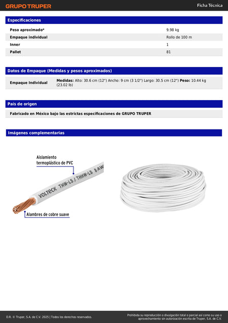Cable THHW-LS 8 AWG Blanco 100m Volteck - Solución Profesional para Instalaciones Eléctricas Residenciales y Comerciales