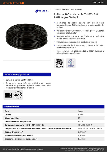 Cable THHW-LS 8 AWG Negro 100m Volteck - Solución Profesional para Instalaciones Eléctricas Seguras