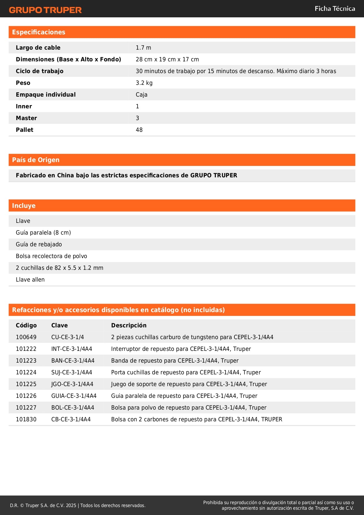 Modelo CEPEL-3-1/4A4 - El cepillo eléctrico ideal para trabajos profesionales de carpintería, acabados finos y cepillado de madera de alta precisión.