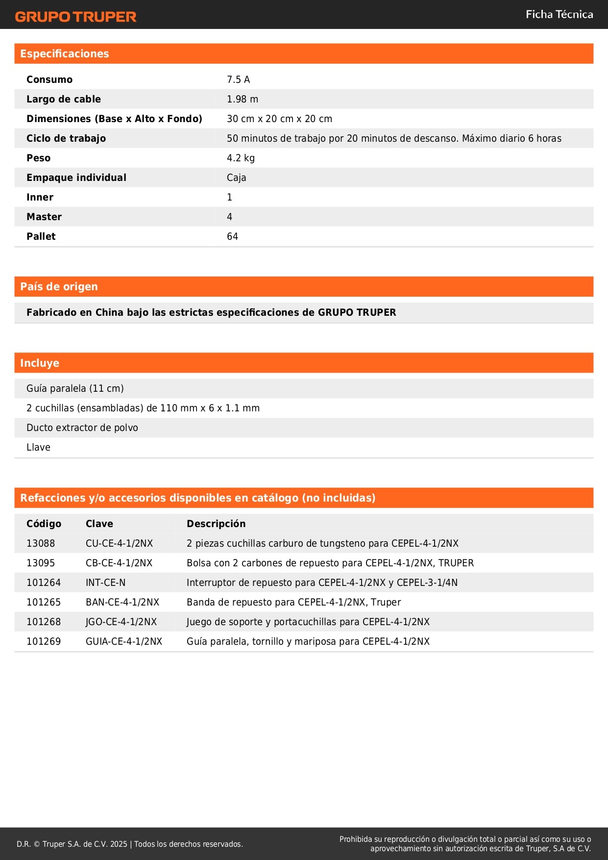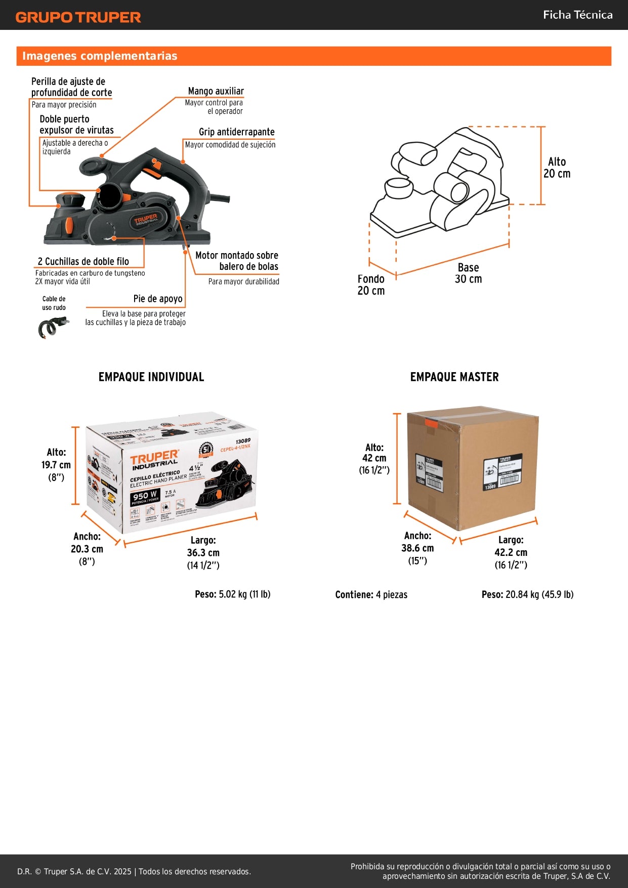 Especificaciones técnicas: Motor 950W | Ancho 4-1/2" | Cuchillas carburo tungsteno | Uso industrial