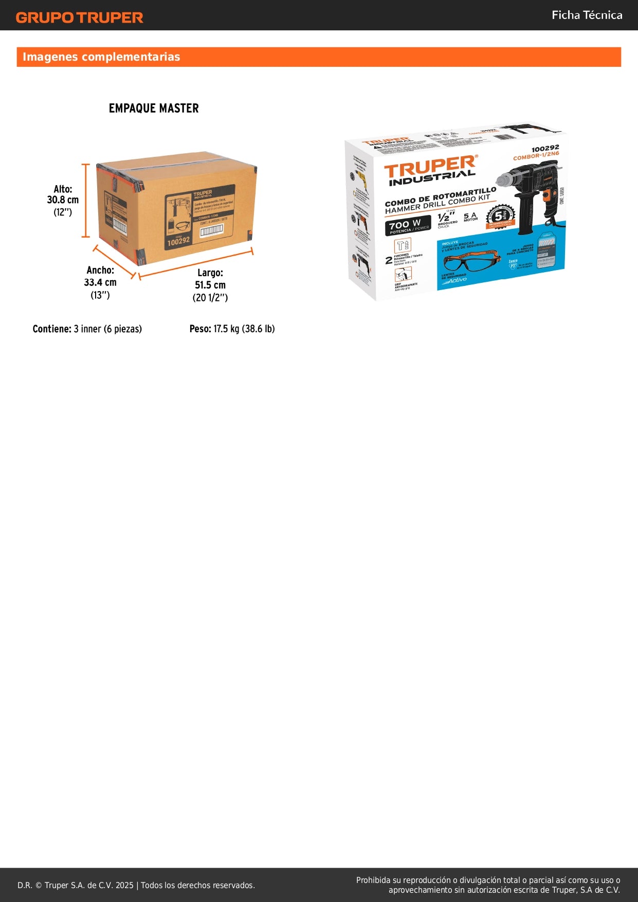 Combo completo para perforación profesional en concreto, mampostería y materiales duros. Este rotomartillo industrial Truper de 1/2 pulgada combina potencia, precisión y durabilidad para trabajos exigentes de construcción y remodelación.