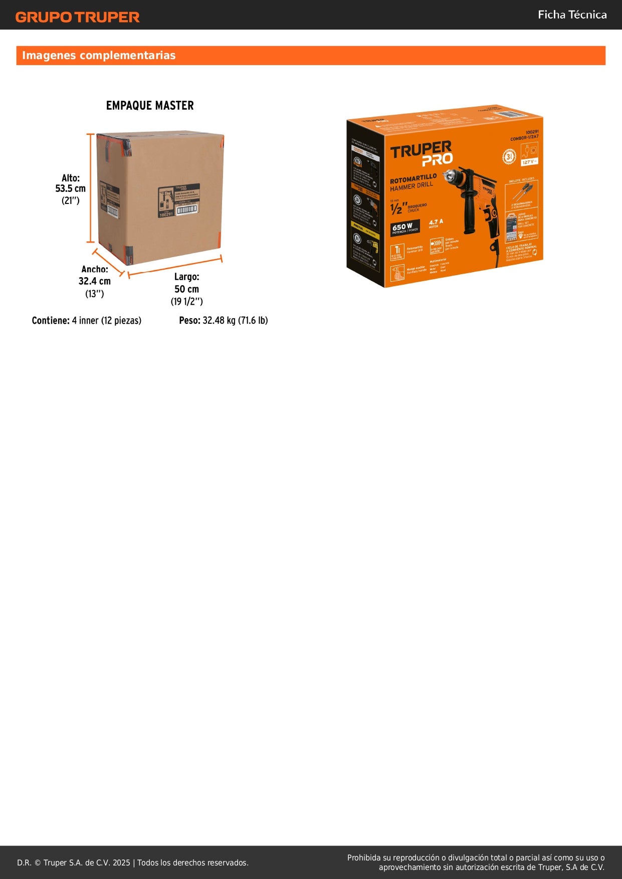 Marca líder en herramientas profesionales con garantía de calidad. Este rotomartillo TRUPER está diseñado para soportar trabajo continuo y condiciones exigentes.