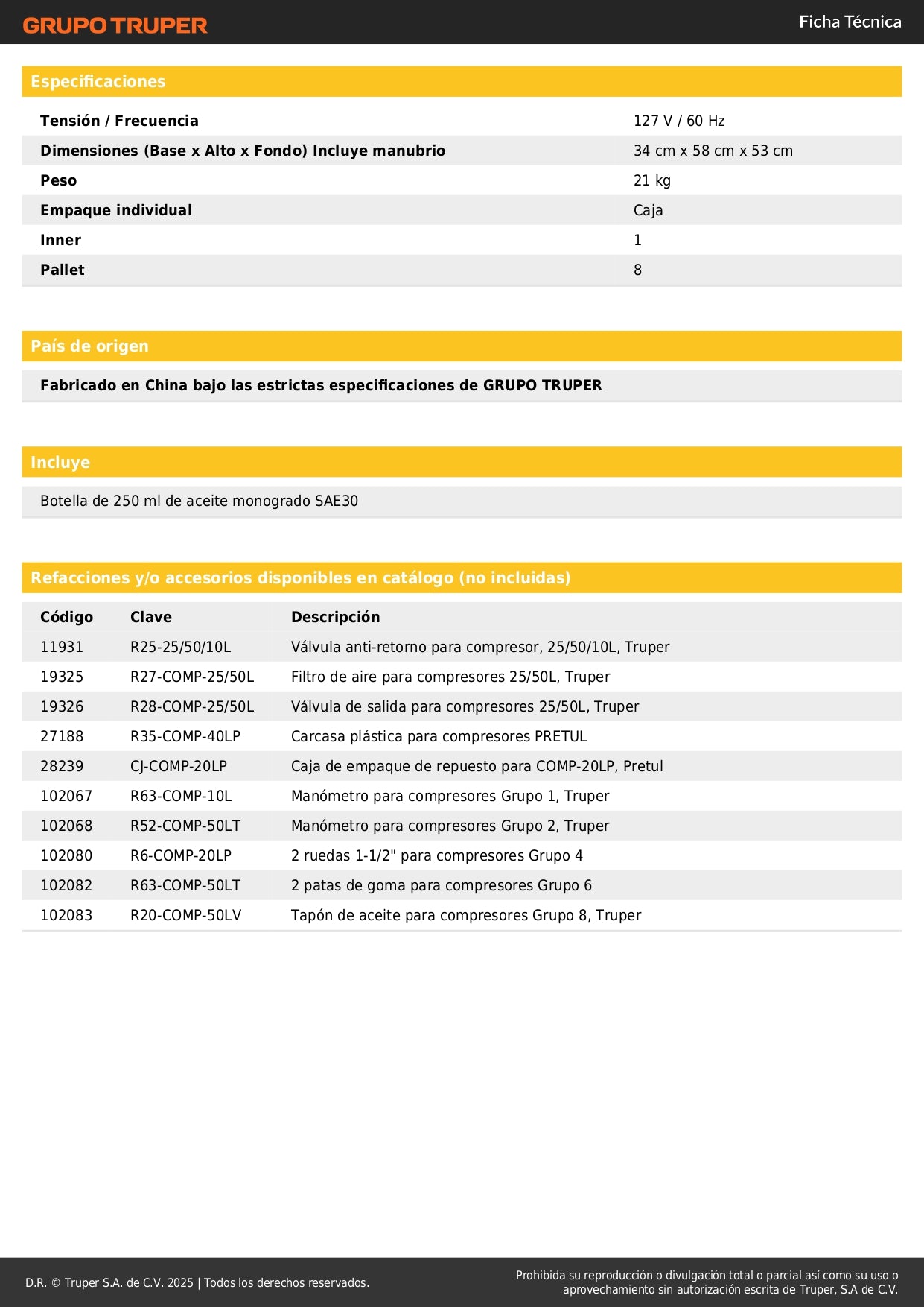 - Sistema lubricado - Mayor durabilidad y menor mantenimiento del compresor