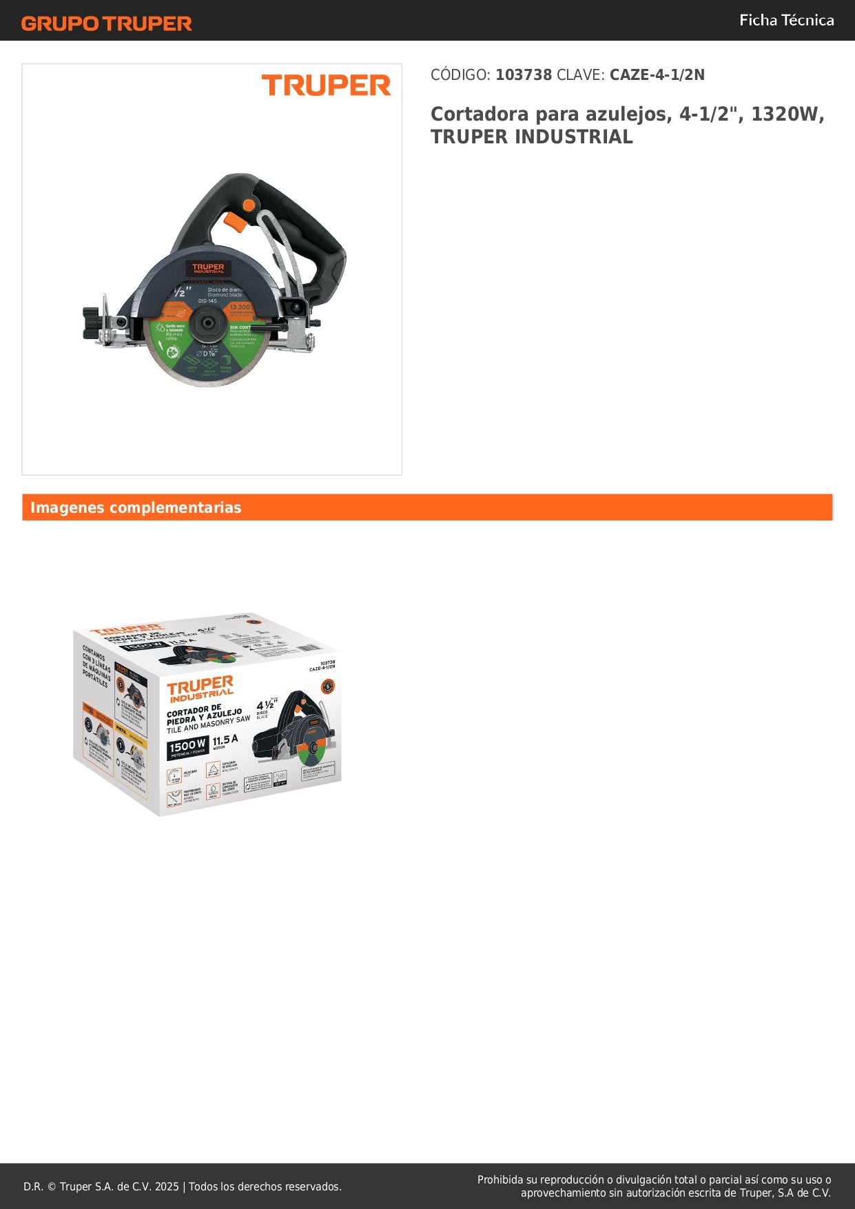 Cortadora de Azulejos TRUPER Industrial 4-1/2" 1320W - Cortes Precisos y Profesionales para Cerámica y Porcelanato - CAZE-4-1/2N