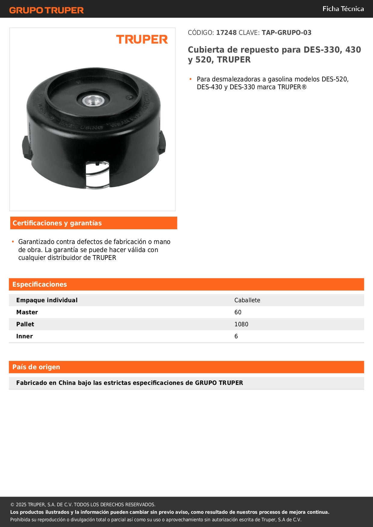Cubierta de Repuesto Original TRUPER para Desbrozadoras DES-330, DES-430 y DES-520