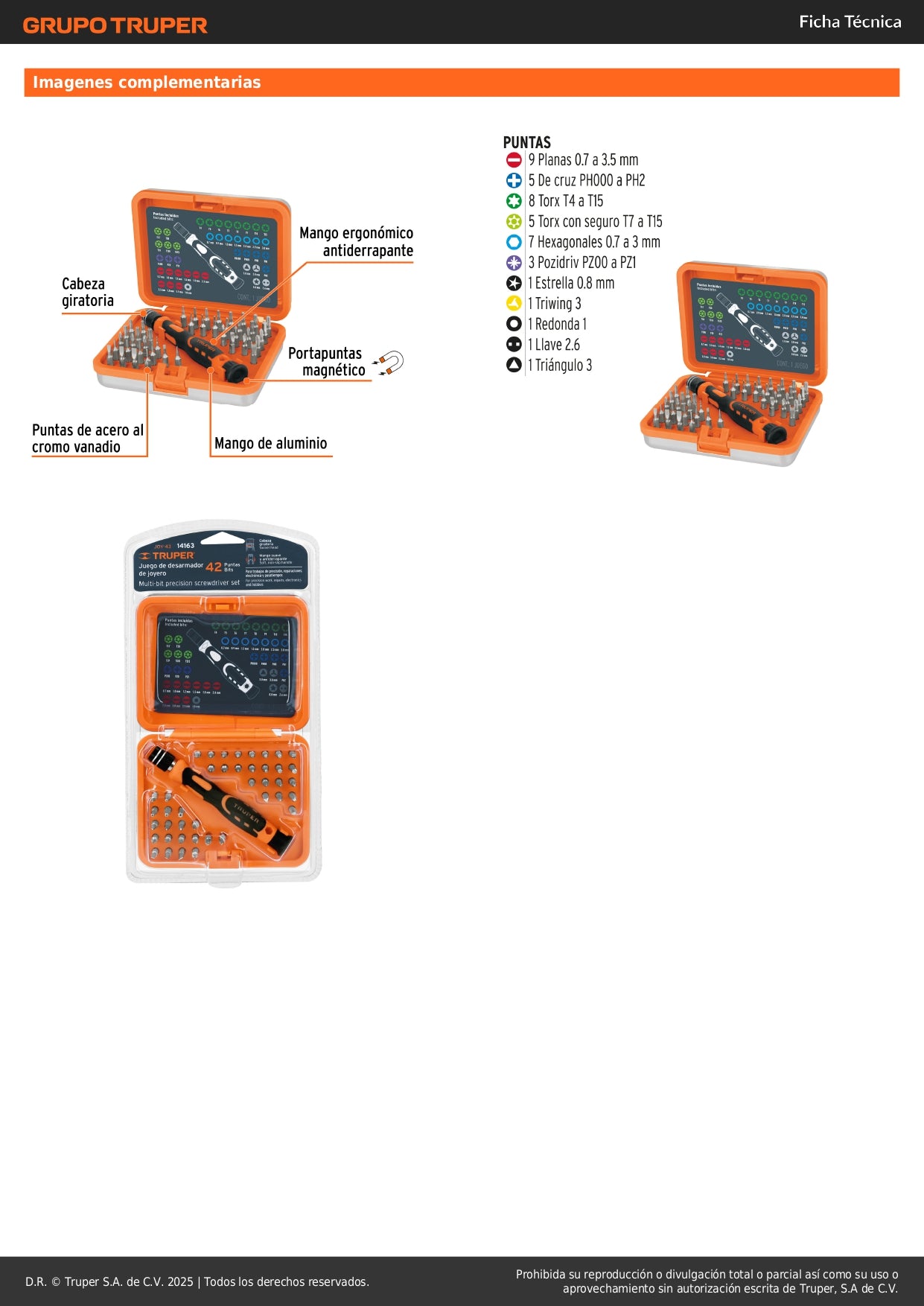 - 42 puntas de precisión intercambiables - Compatibles con tornillos Phillips, planos, Torx, hexagonales y más