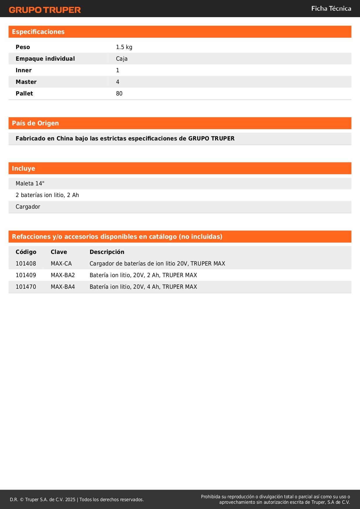 - Batería de Litio 20V 2.0Ah: Incluye 2 baterías intercambiables para trabajo continuo sin interrupciones