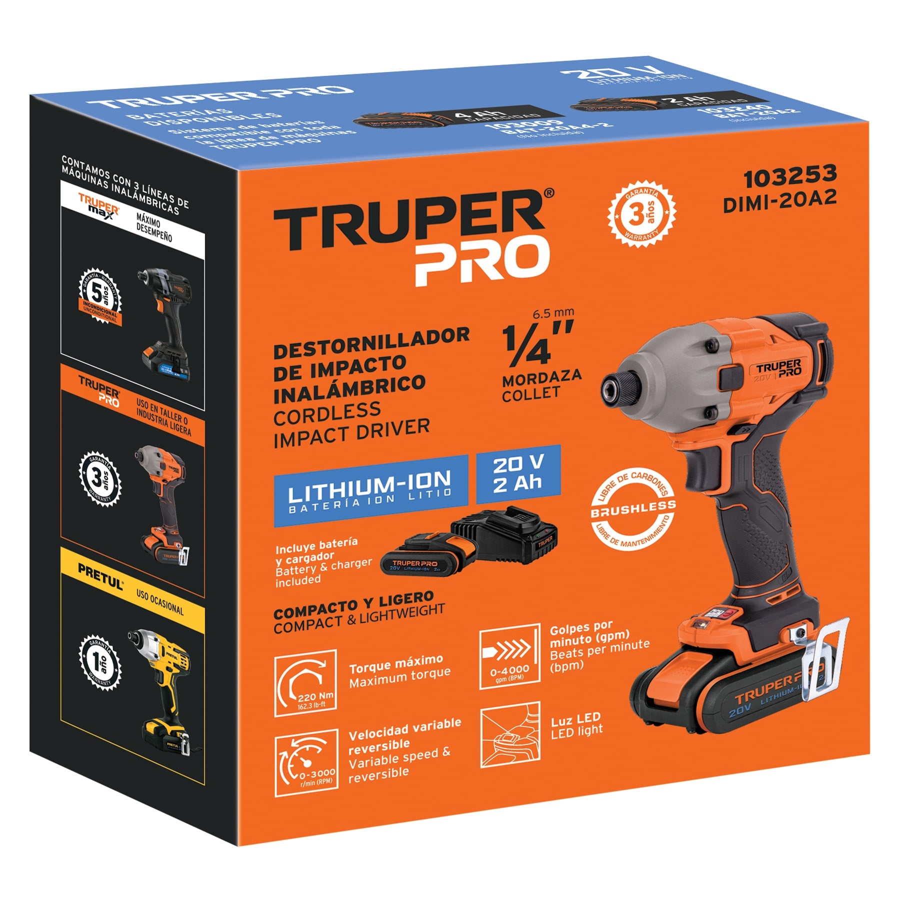 Destornillador de Impacto Inalámbrico 20V Truper PRO DIMI-20A2 - Potencia Profesional con Motor Brushless
