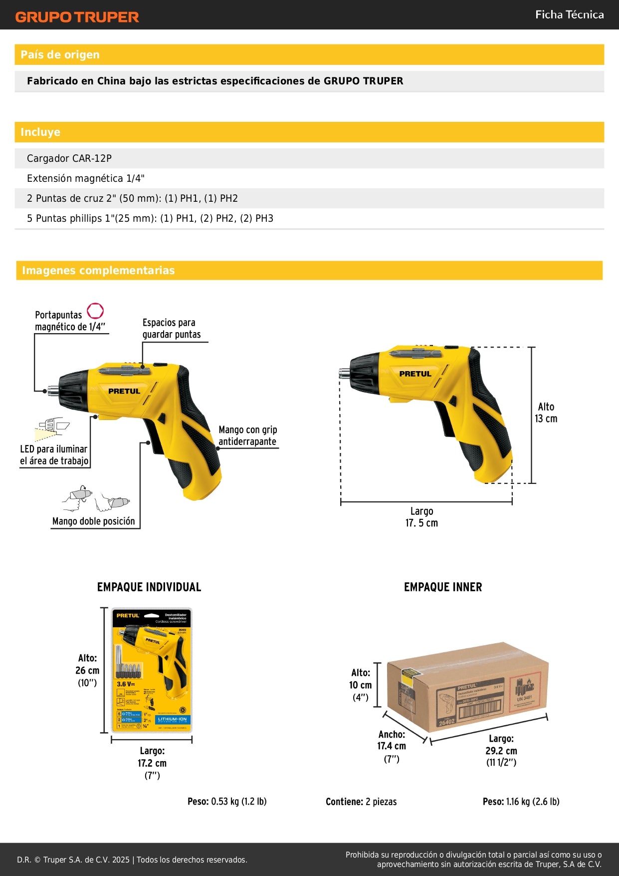 PRETUL es sinónimo de calidad profesional y durabilidad. Este destornillador eléctrico está diseñado para ofrecer rendimiento constante en cada proyecto, desde tareas domésticas hasta aplicaciones industriales ligeras.