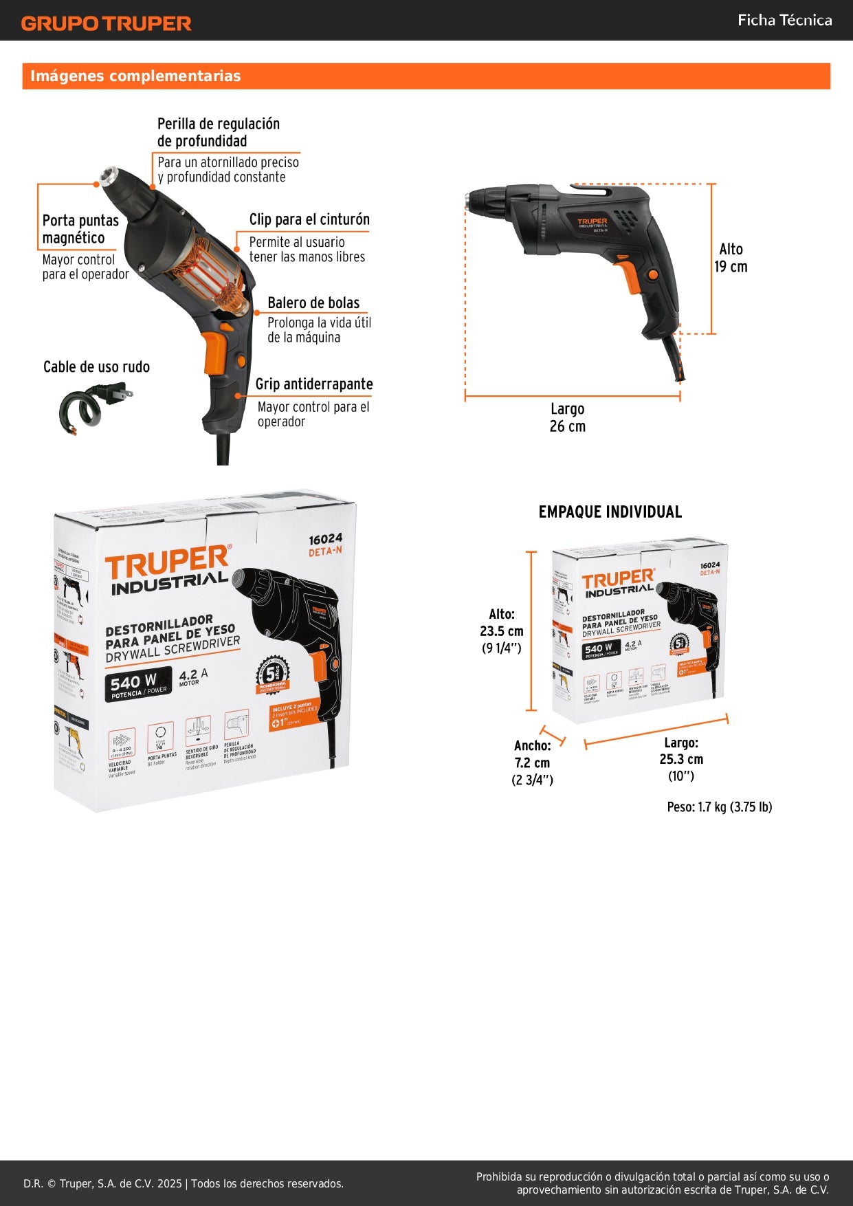 El destornillador para panel de yeso TRUPER es la herramienta profesional ideal para instaladores, contratistas y profesionales de la construcción en seco. Con su potente motor de 540W, este atornillador eléctrico garantiza precisión y eficiencia en cada aplicación.