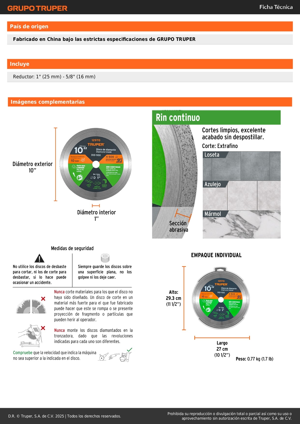 - Diámetro: 10 pulgadas (254 mm) - tamaño estándar para cortadoras profesionales