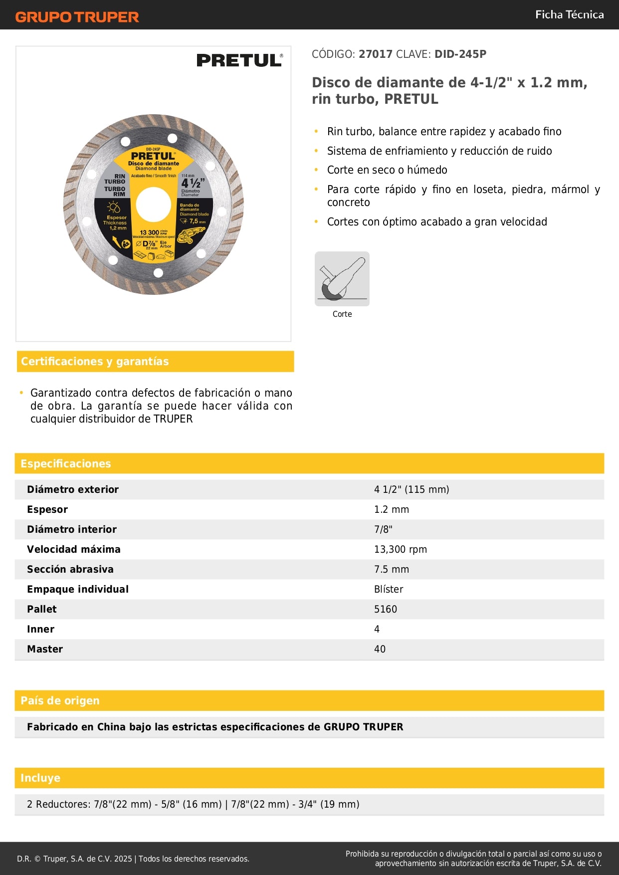 - ✓ Diseño rin turbo: mayor velocidad de corte y mejor refrigeración