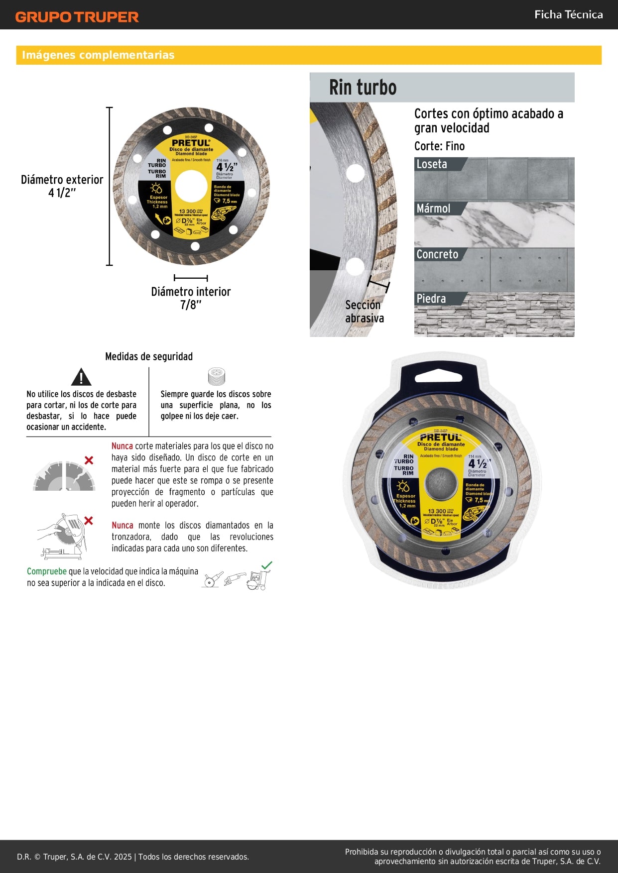 Disco de Diamante 4-1/2" Rin Turbo PRETUL - Corte Profesional