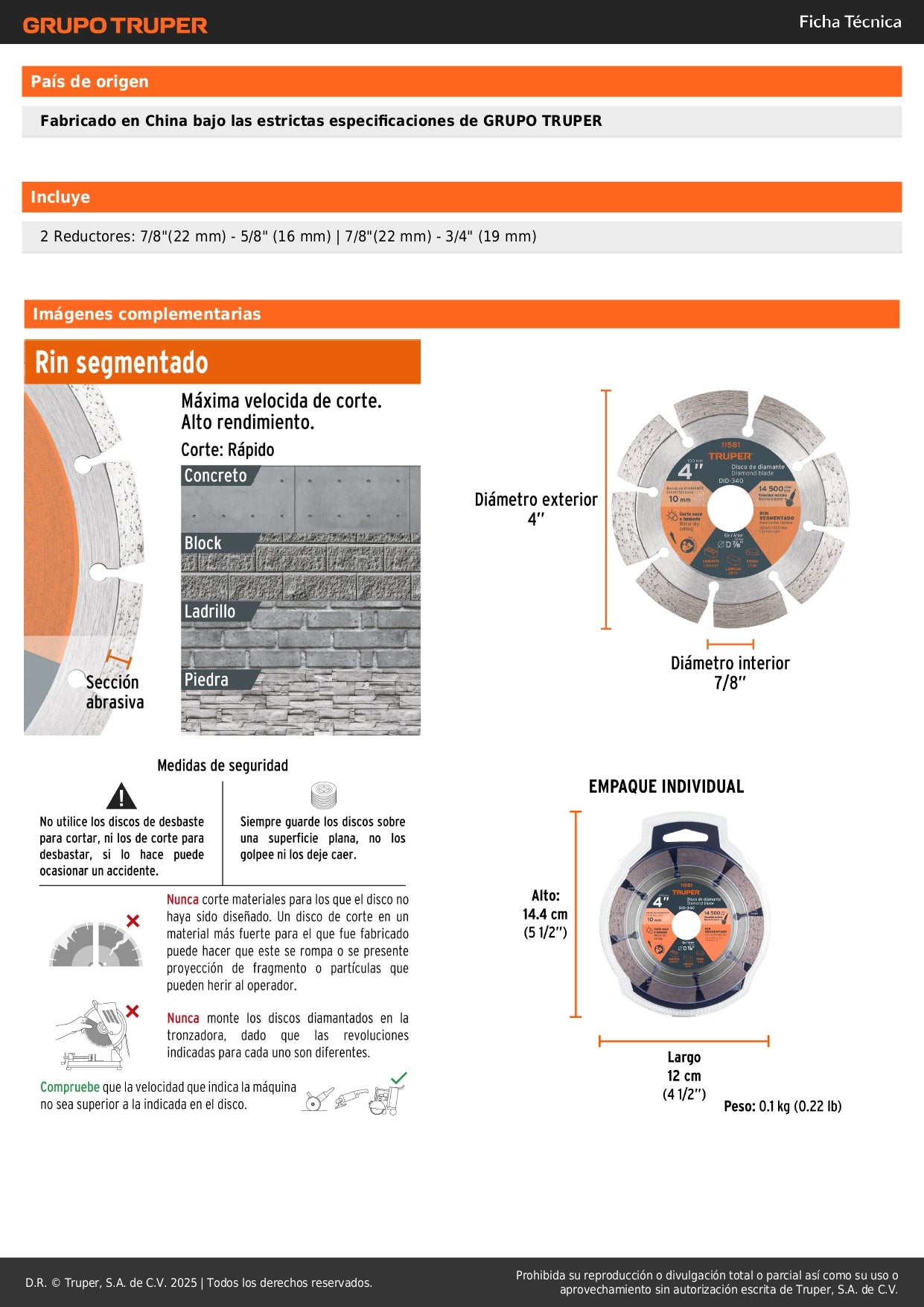 El diseño de rin segmentado permite una mejor disipación del calor durante el corte, prolongando la vida útil del disco y mejorando el rendimiento en trabajos continuos. Ideal para construcción, albañilería, remodelación y trabajos de corte en seco o húmedo.