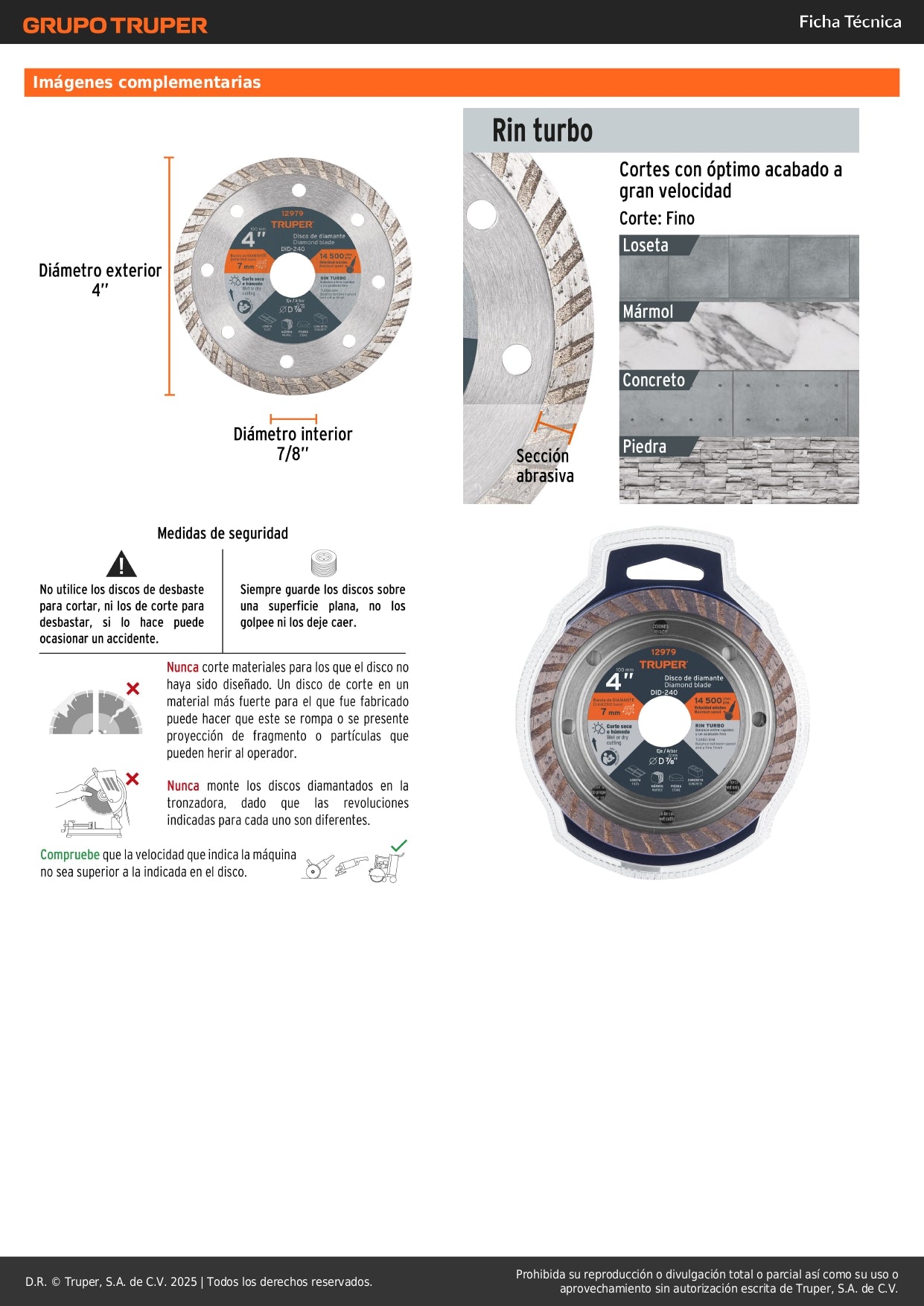 - Tecnología Rin Turbo: segmentos continuos con diseño turbo para máxima velocidad de corte