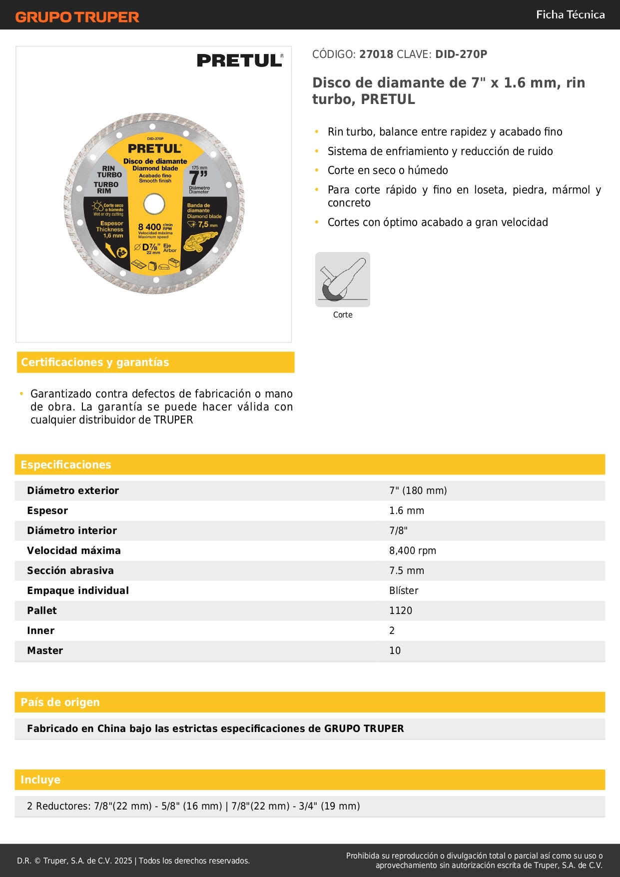 - Diámetro: 7 pulgadas (180 mm) - tamaño estándar para amoladoras y cortadoras