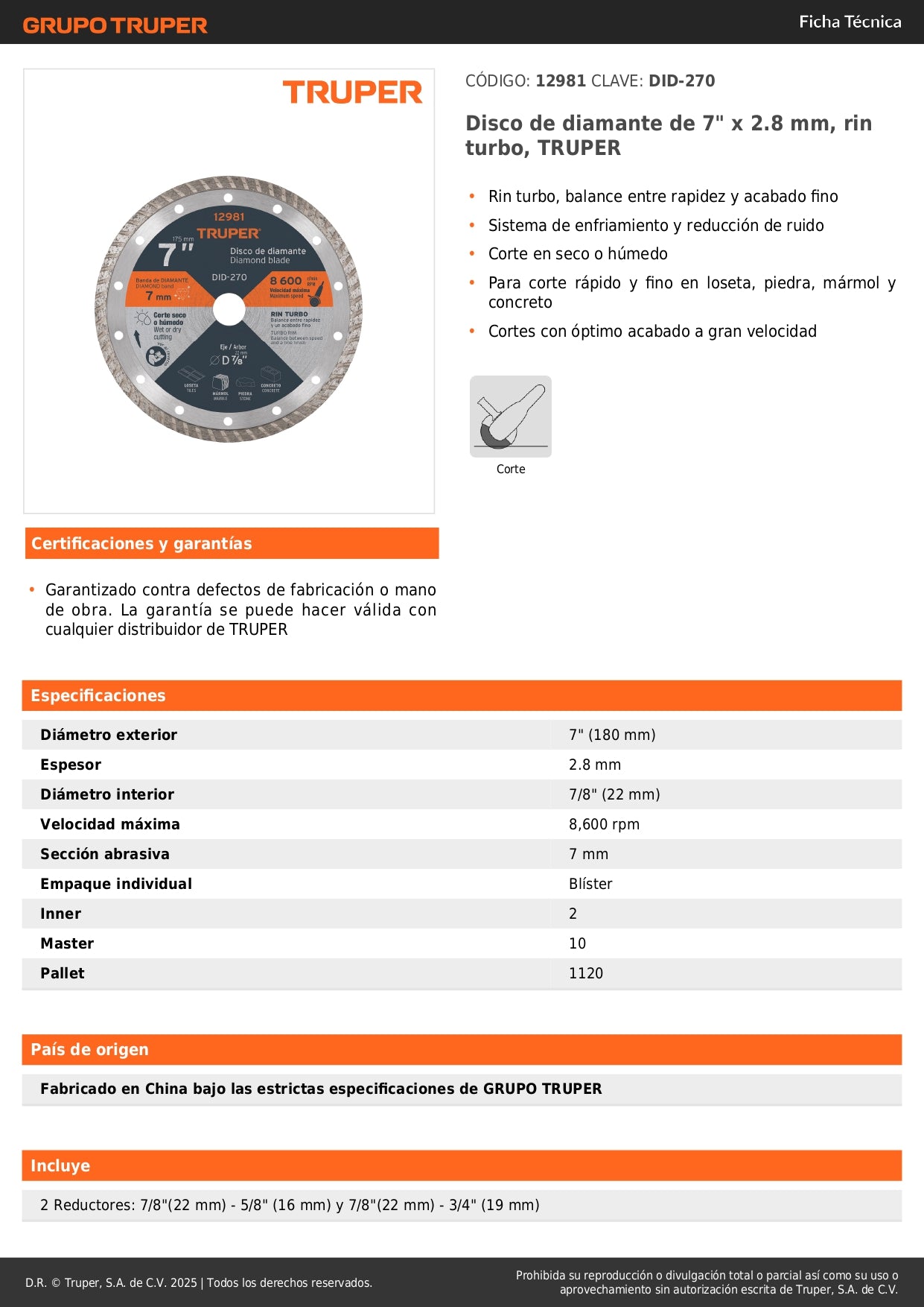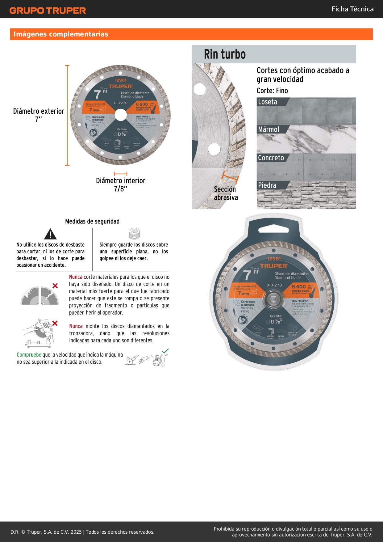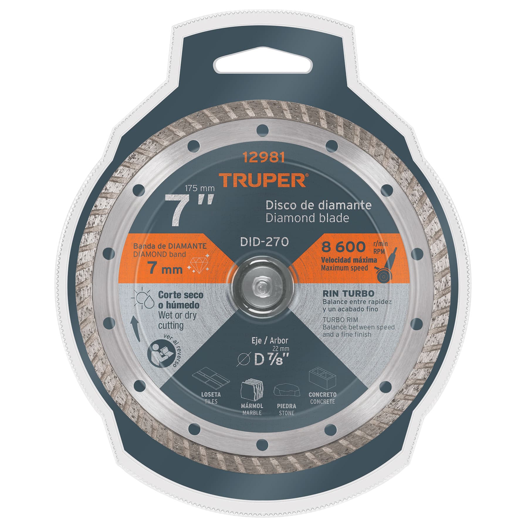 Disco de diamante de 7" x 2.8 mm, rin turbo, TRUPER