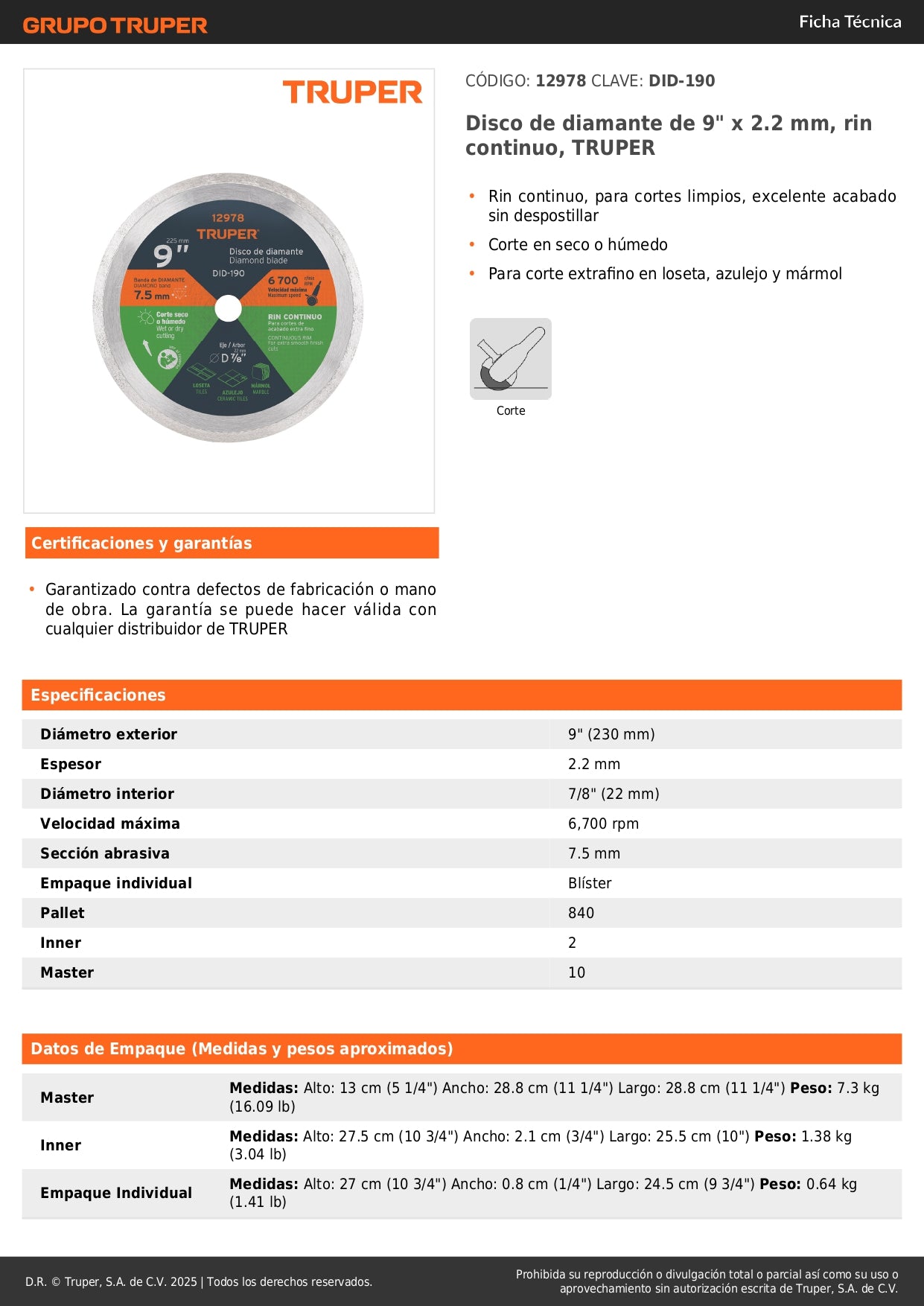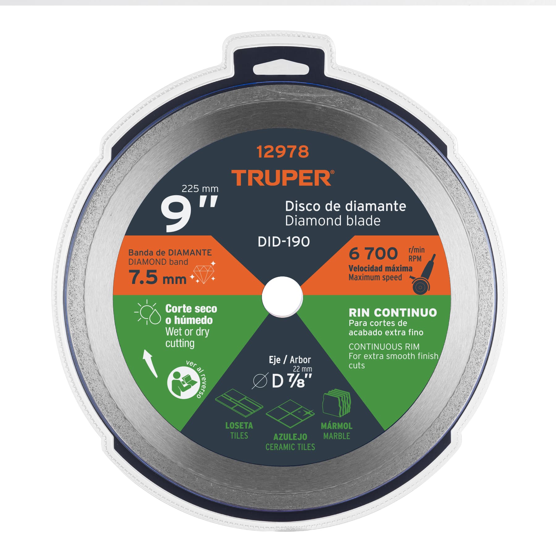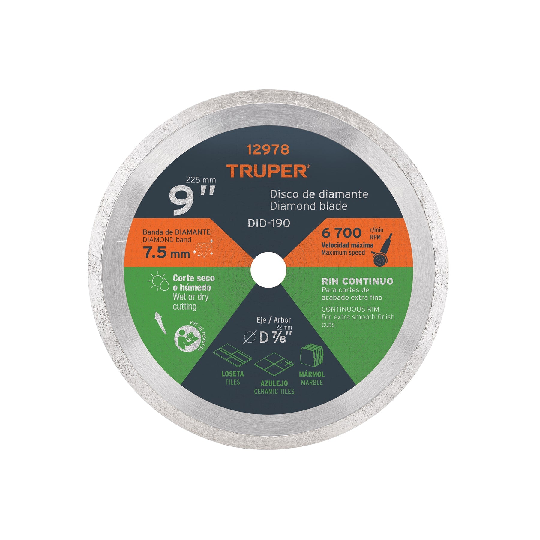 ¡Invierte en calidad TRUPER! Este disco de diamante profesional te brindará años de servicio confiable en tus proyectos de construcción y remodelación. Compatible con esmeriladora angular de 9".