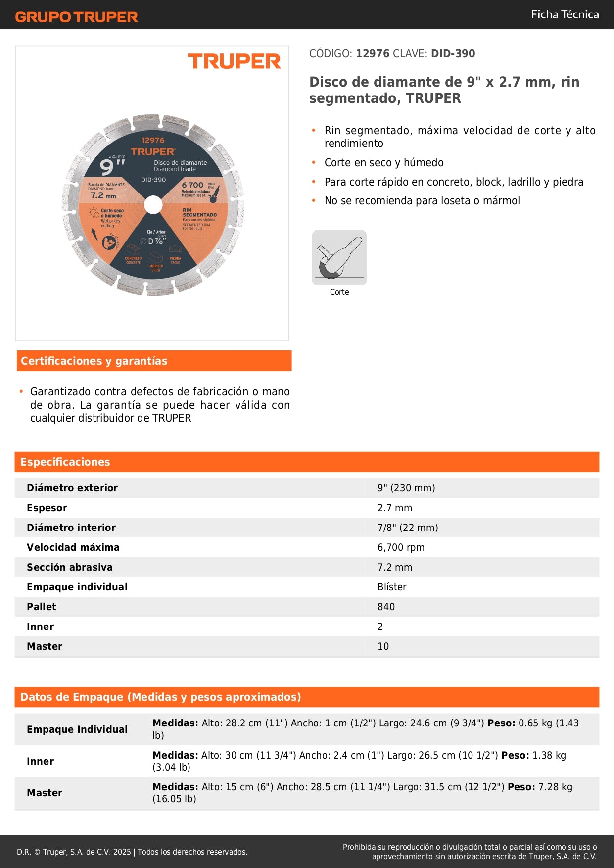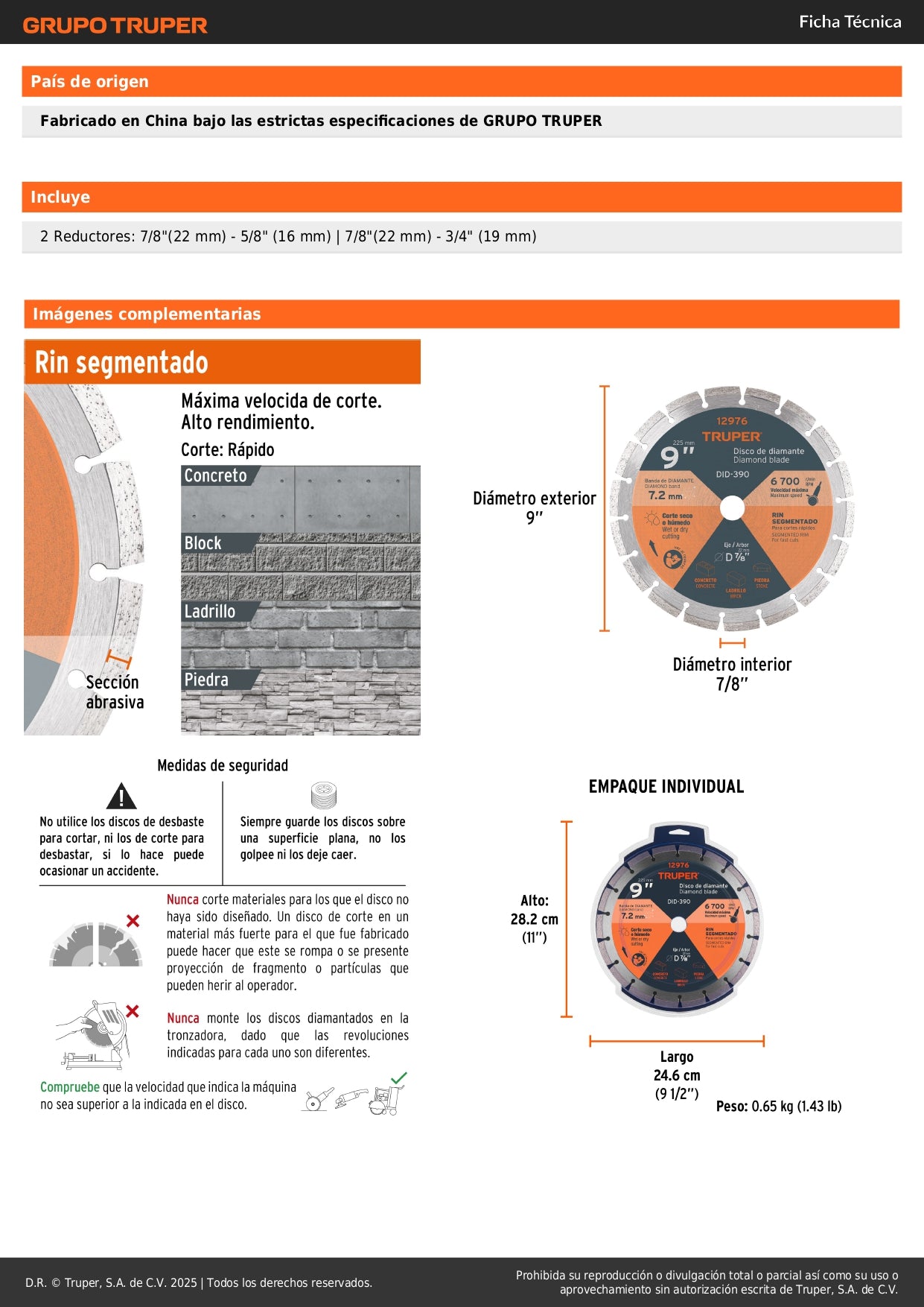 Disco de diamante de 9 pulgadas con rin segmentado ideal para corte profesional de concreto, mampostería, ladrillo, block y materiales de construcción. Fabricado por TRUPER, marca líder en herramientas de calidad.