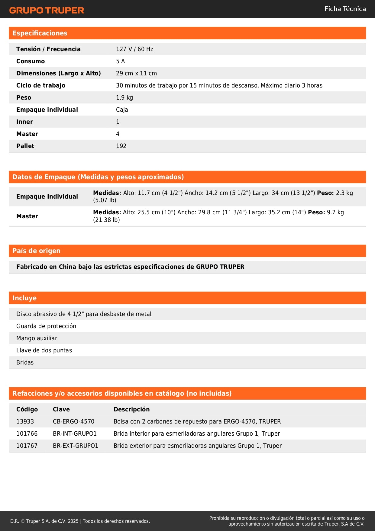 Esmeriladora Angular 4-1/2" TRUPER ERGO PRO ERGO-4570 - Potencia y Precisión Profesional