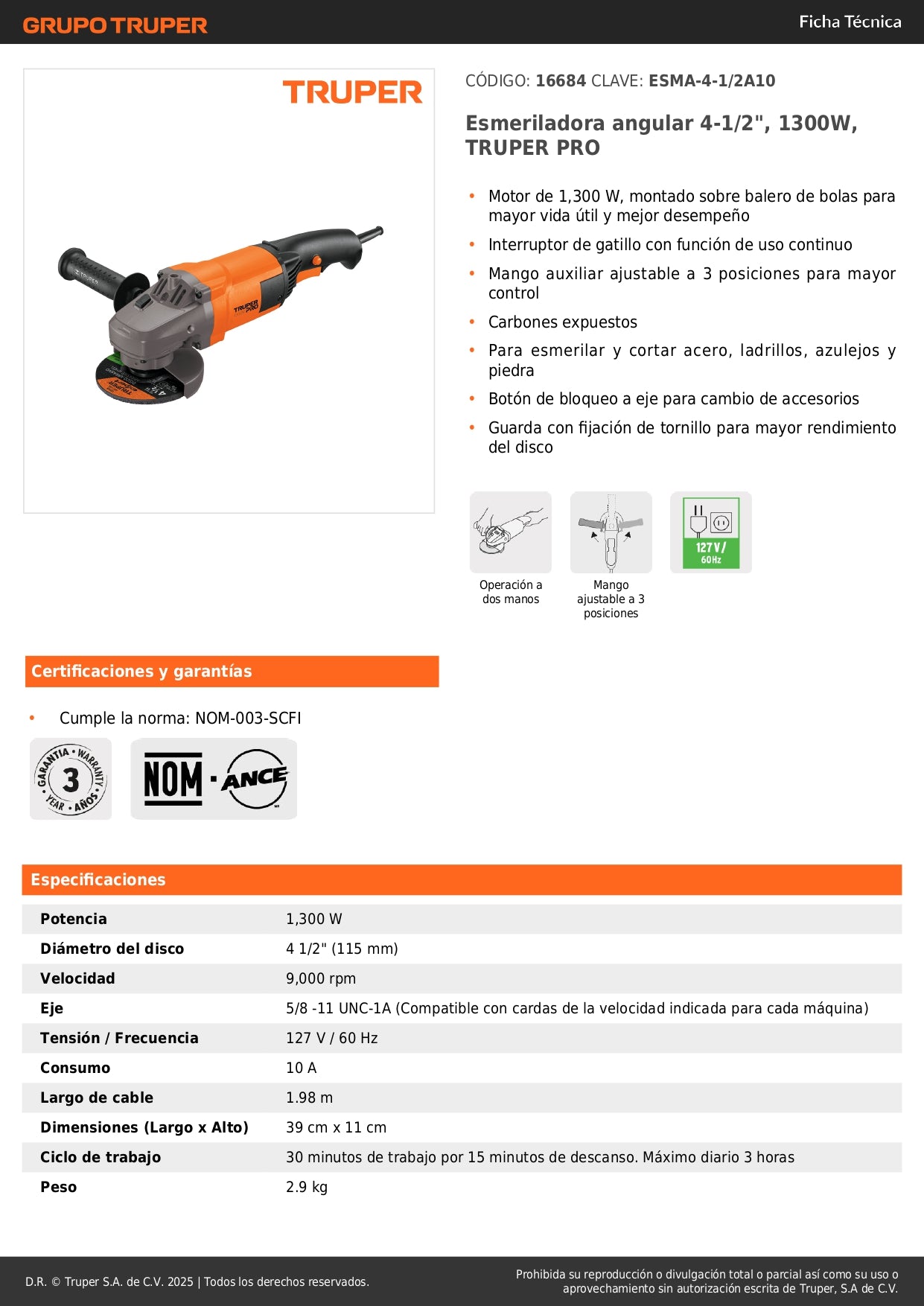 La línea TRUPER PRO está diseñada para profesionales y usuarios exigentes que buscan herramientas de alto rendimiento. Esta amoladora angular combina potencia, precisión y durabilidad para trabajos de construcción, herrería, plomería y mantenimiento industrial.