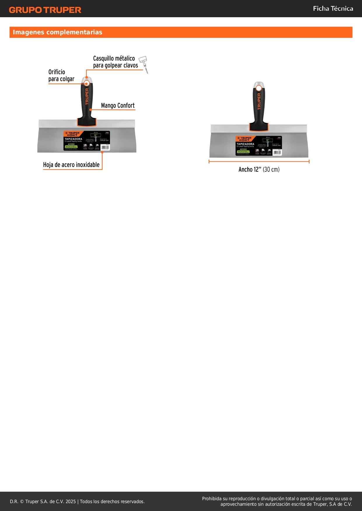 Espátula de acero inoxidable de 12 pulgadas diseñada específicamente para trabajos profesionales de tapicería, acabados y aplicación de masilla. La Truper Expert ETA-12X combina durabilidad, precisión y comodidad en una sola herramienta.