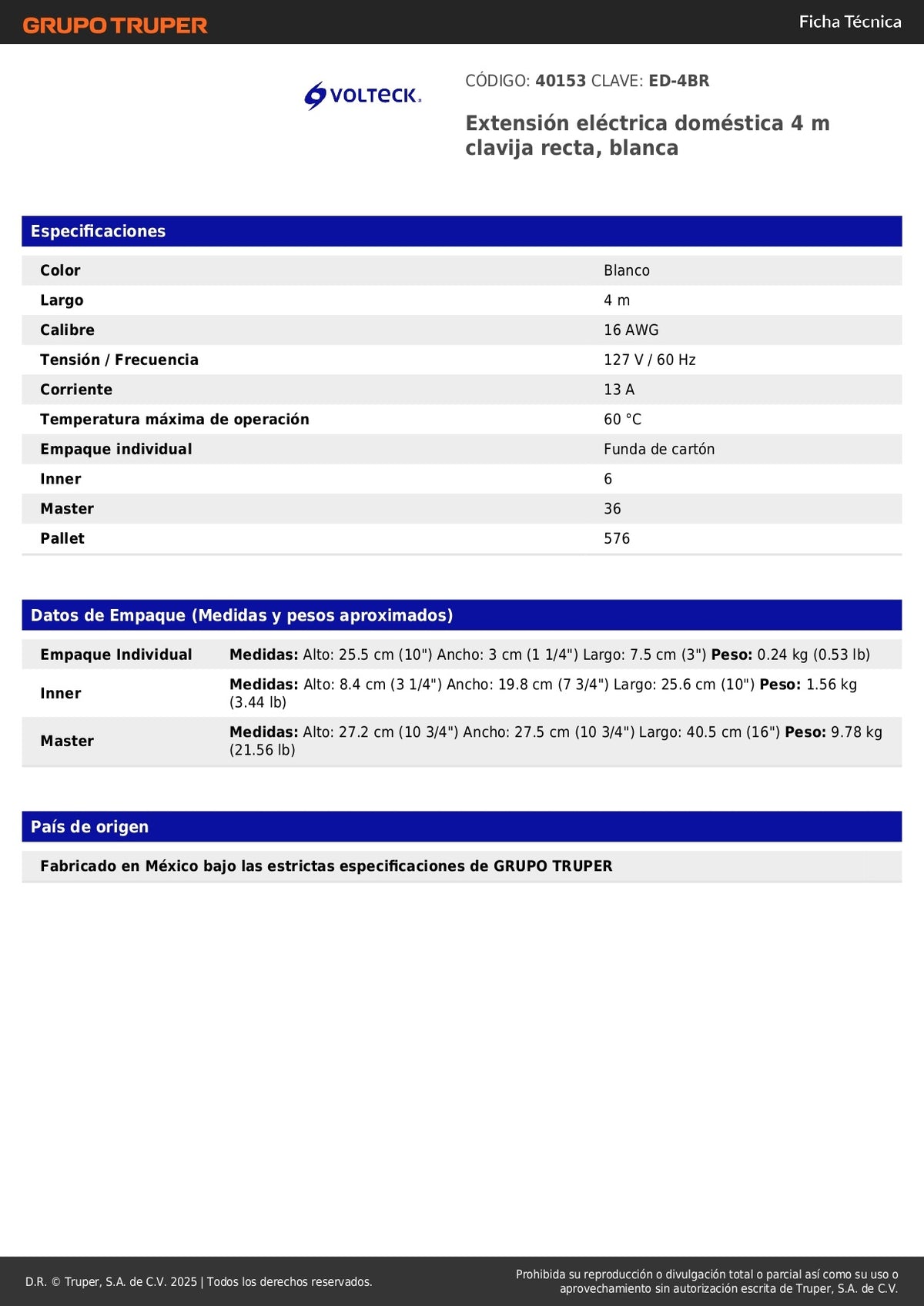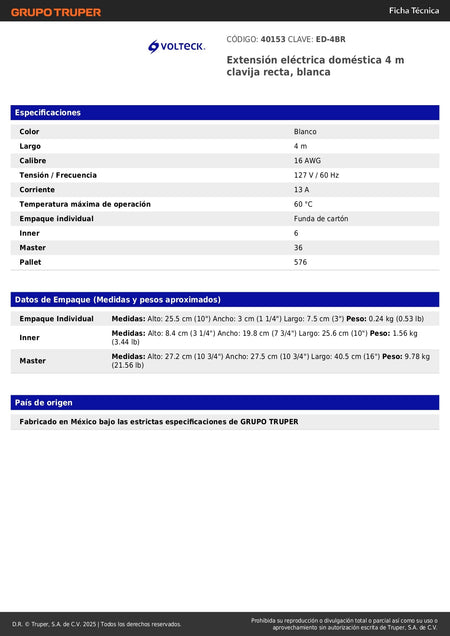 Extensión Eléctrica 4 Metros ED-4BR - Cable Doméstico Blanco con Clavija Recta para Conexión Segura de Electrodomésticos