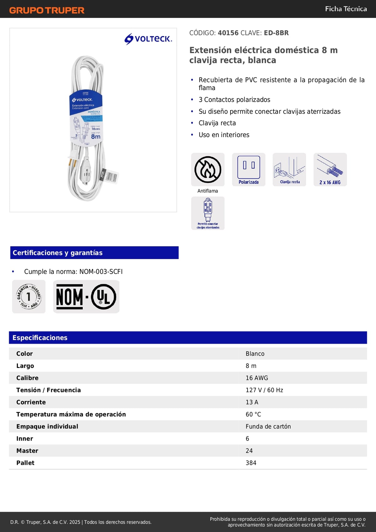 Extensión Eléctrica 8 Metros ED-8BR - Cable Polarizado PVC Resistente Flama para Interiores - Solución Segura Conexión Múltiple