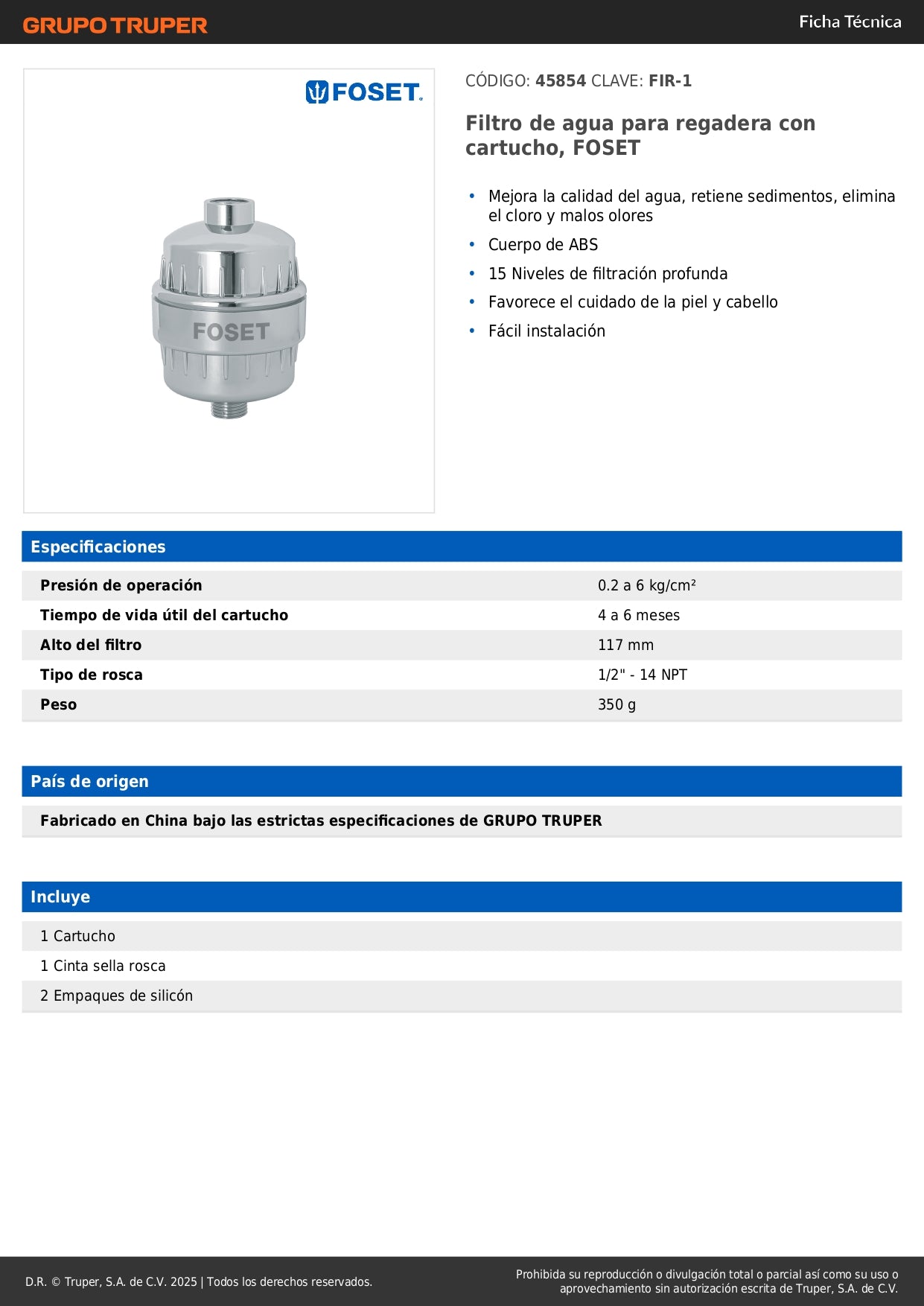 Filtro de Agua para Regadera FOSET FIR-1 - Purificación Avanzada