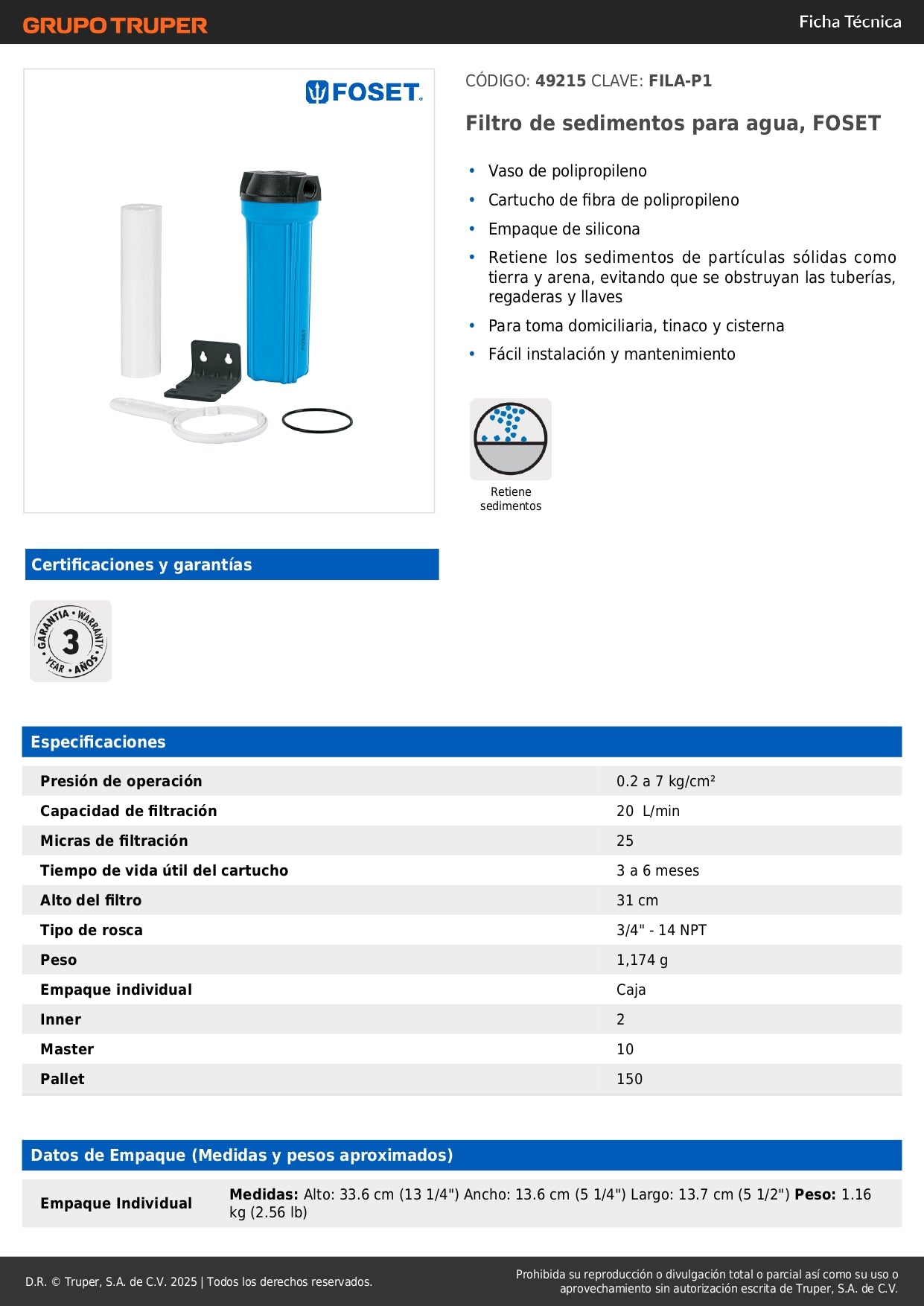 Invierte en la protección de tu sistema hidráulico y disfruta de agua más limpia con el filtro de sedimentos FOSET FILA-P1. Tu hogar y tus equipos lo agradecerán.